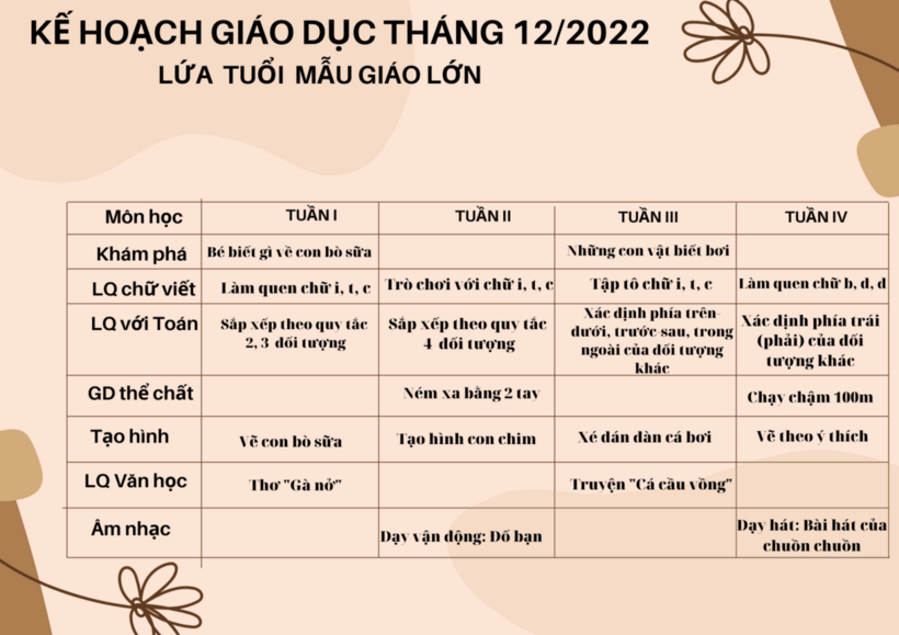 Thời khoá biểu tháng 12/2022- Lứa tuổi Mẫu giáo lớn