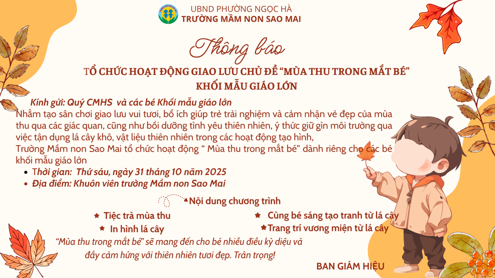 Thông báo Tổ chức Hoạt động giao lưu "Mùa thu trong mắt bé" - Khối Mẫu giáo lớn của Trường mầm non Sao Mai