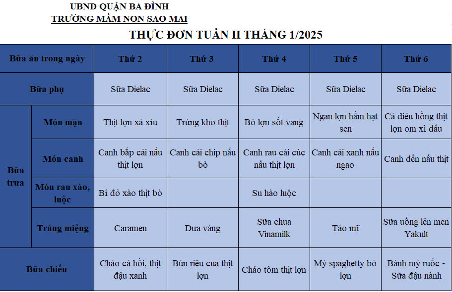 Thực đơn cho trẻ tuần II tháng 1 (Từ 06/1 đến 10/1)