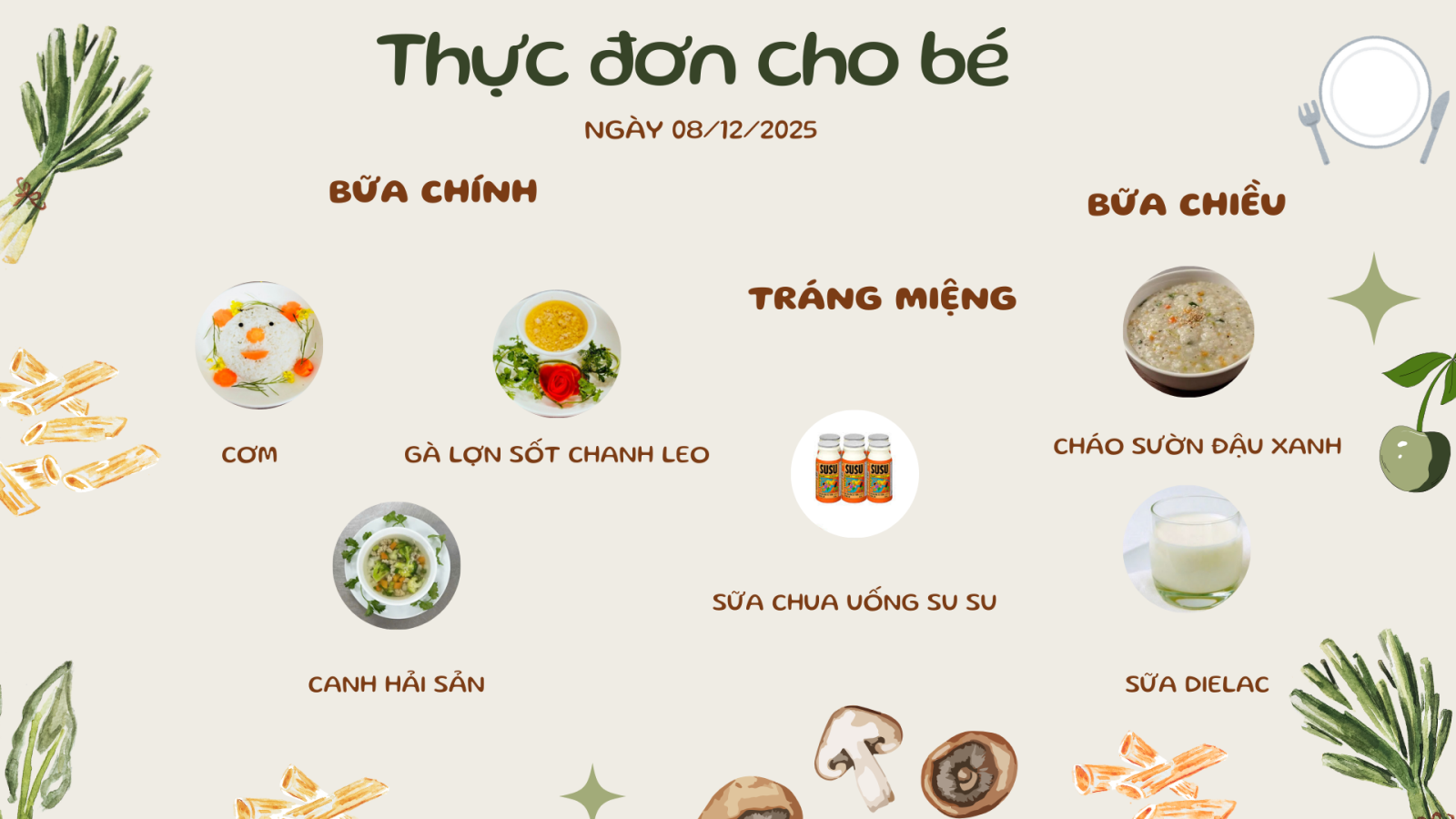 Trường Mầm non Sao Mai xin trân trọng gửi tới Quý phụ huynh Thực đơn cho trẻ tuần II tháng 12/2025 (từ ngày 08 - 12/12). Thực đơn được thiết kế đa dạng, đủ chất và an toàn, nhằm mang đến cho các con những bữa ăn ngon miệng, hỗ trợ phát triển khỏe mạnh mỗi ngày. Chúc các con luôn ăn ngon, lớn khỏe! Xin chân thành cảm ơn Quý phụ huynh đã tin tưởng và đồng hành cùng Trường Mầm non Sao Mai trong công tác chăm sóc dinh dưỡng.