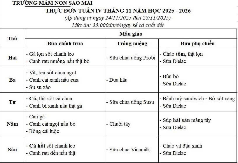 Trường Mầm non Sao Mai thân gửi Quý phụ huynh Thực đơn cho trẻ tuần IV tháng 11, từ ngày 24 - 28/11/2025. Với tiêu chí: Ngon miệng, đủ chất, đa dạng món ăn, đảm bảo an toàn vệ sinh. Các bác nhân viên, các cô giáo chúc các con ngon miệng! Xin chân thành cảm ơn quý phụ huynh đã tin tưởng và đồng hành cùng Trường Mầm non Sao Mai trong hành trình chăm sóc dinh dưỡng cho các con.