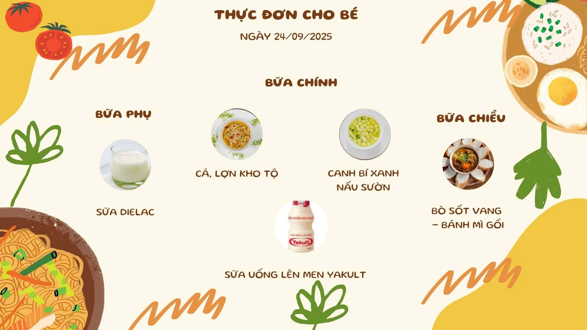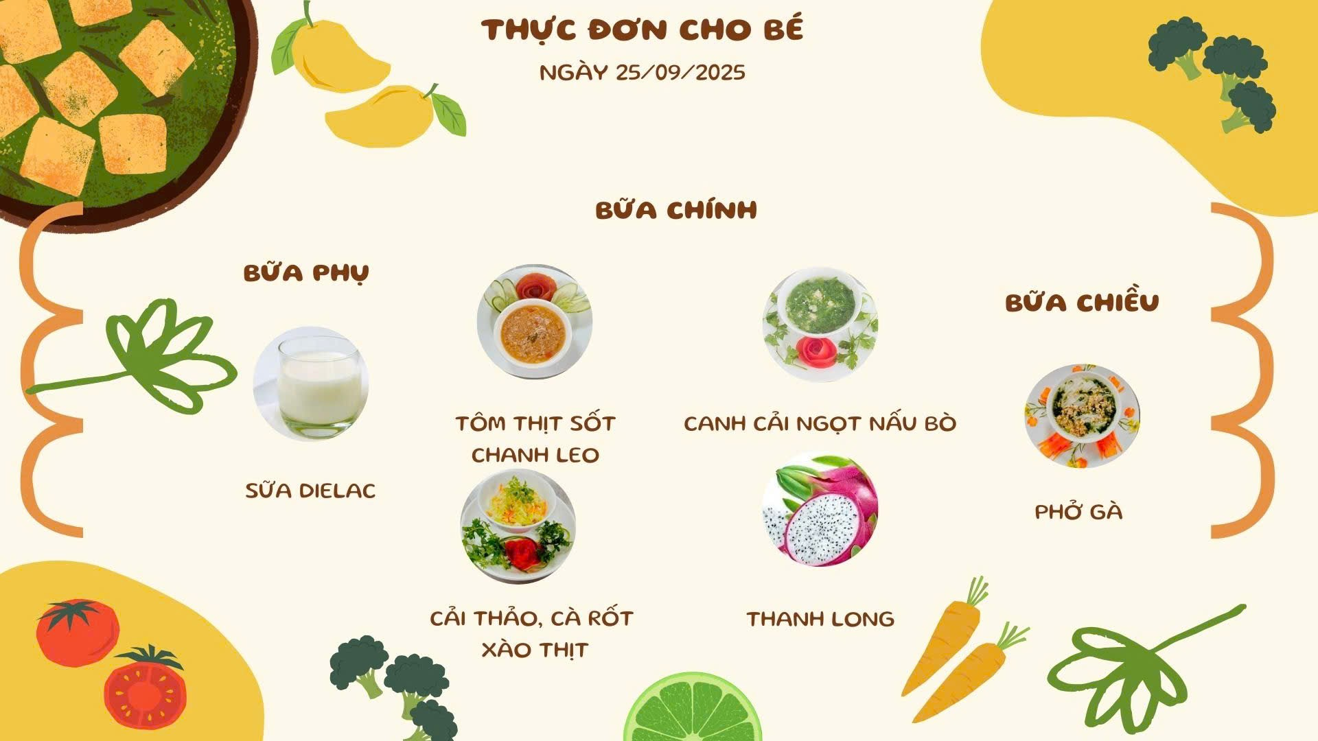 Thực đơn tuần IV tháng 9/2025 (từ ngày 22/9 - 26/9) của Trường Mầm non Sao Mai được xây dựng cân đối, đa dạng, đảm bảo dinh dưỡng và an toàn thực phẩm, giúp các bé ăn ngon miệng và khỏe mạnh mỗi ngày. Nhà trường xin cảm ơn quý phụ huynh đã luôn tin tưởng, đồng hành cùng Sao Mai trong hành trình chăm sóc và nuôi dưỡng các con.
