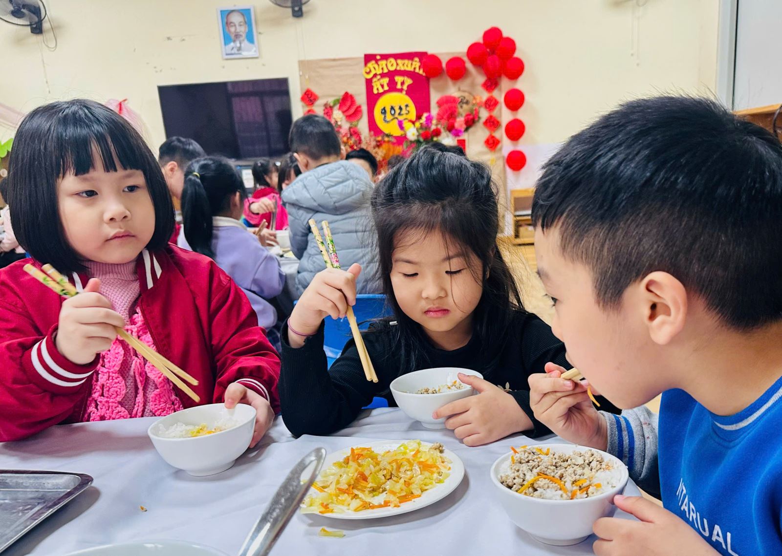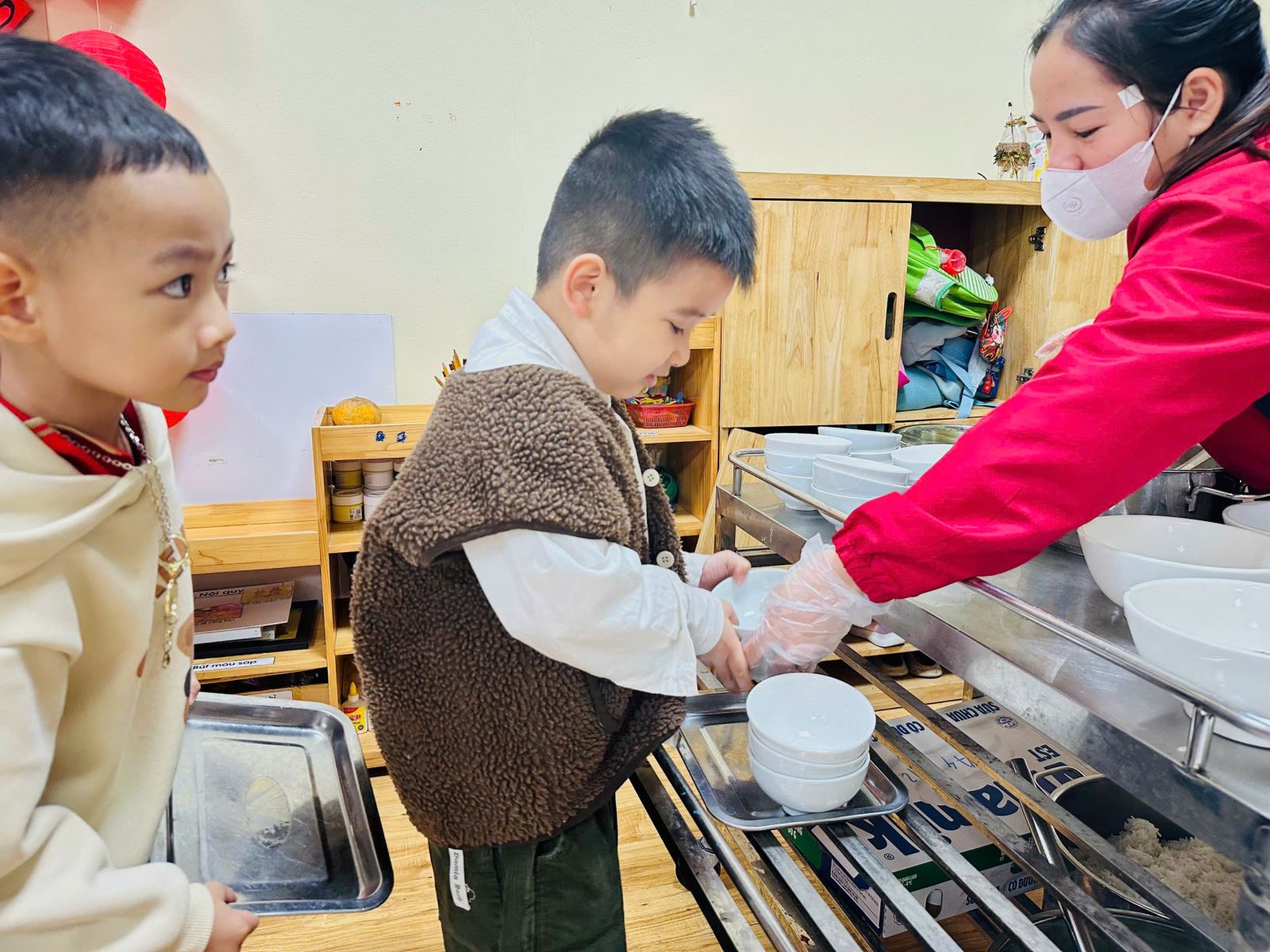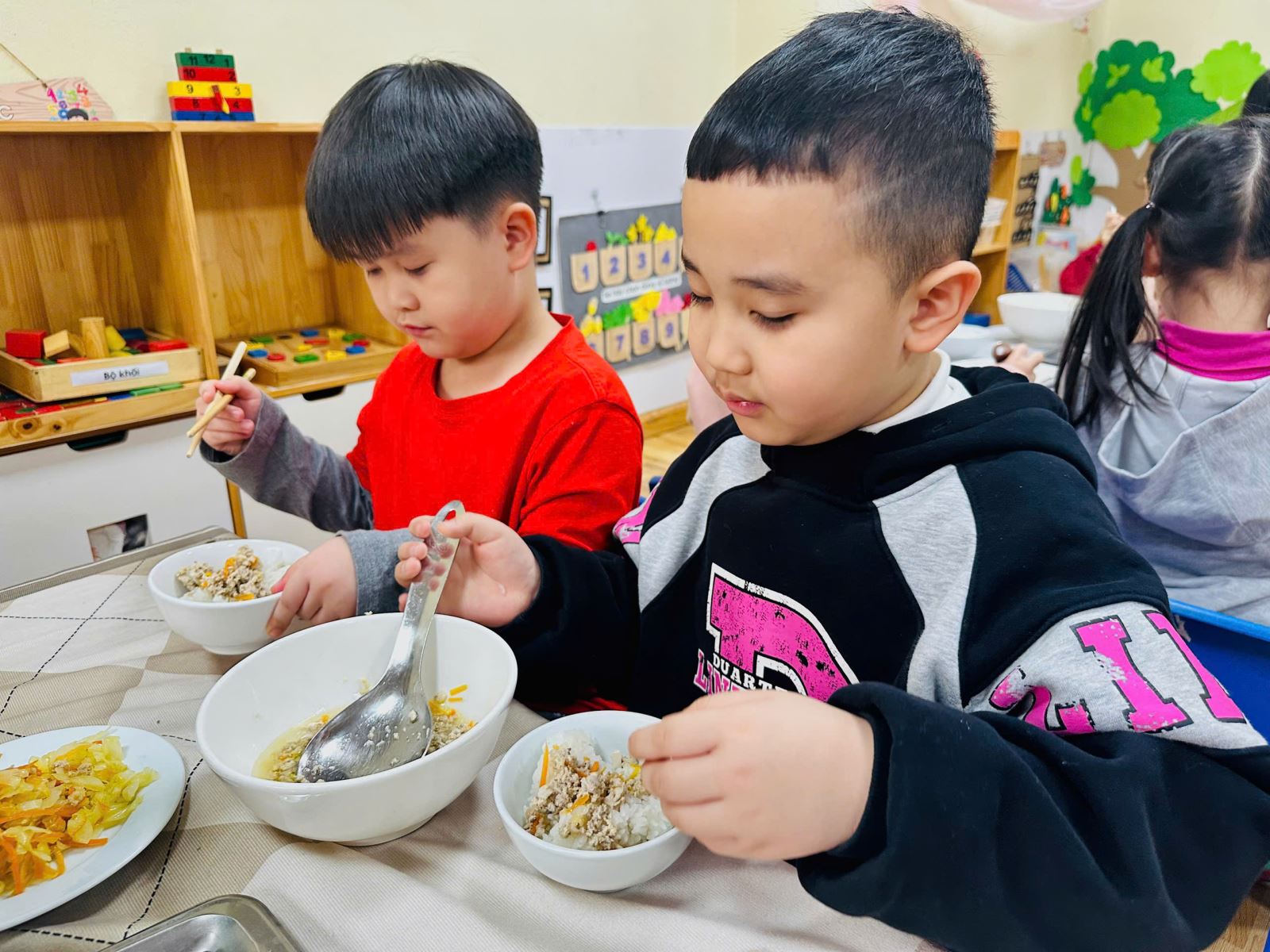 Trong công tác nuôi dưỡng thì việc tổ chức cho trẻ ăn bán trú rất quan trọng, góp phần nâng cao thể lực, phát triển tầm vóc cho trẻ. Tại trường Mầm non Sao Mai, việc tổ chức cho trẻ ăn bán trú thông qua các hình thức tổ chức bữa ăn thường, bữa ăn khay, bữa cơm gia đình được duy trì thường xuyên hàng tháng, hàng tuần. Mỗi một hình thức trẻ sẽ được trải nghiệm theo nhiều cách khác nhau, mang đến cho trẻ cảm xúc mới lạ khi dùng bữa tại nhà trường.