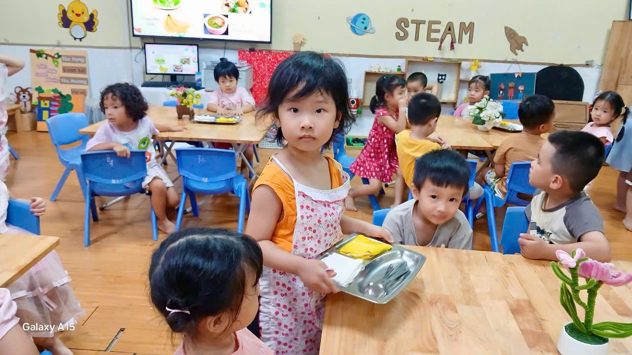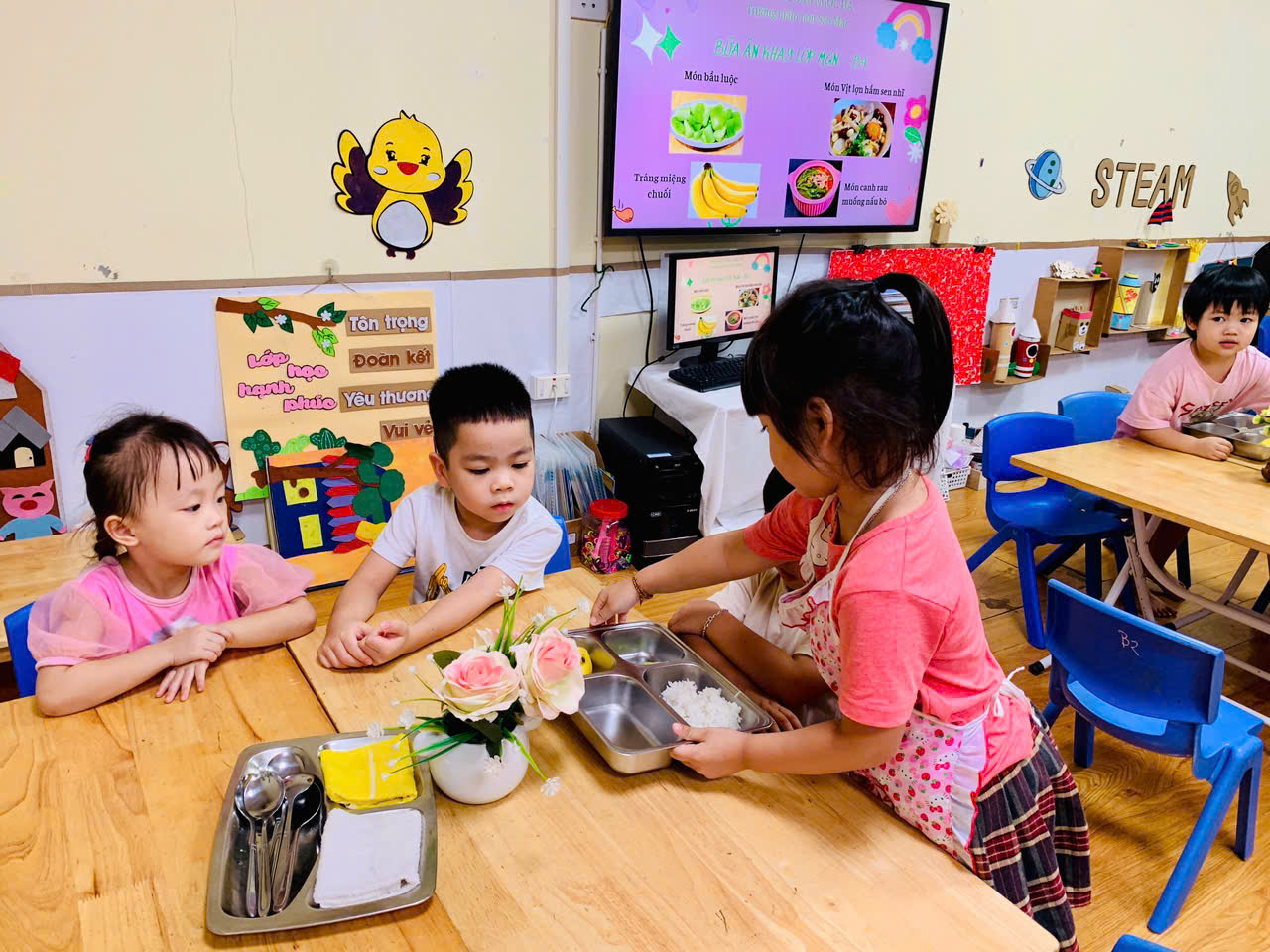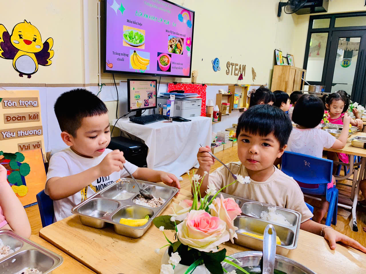 Niềm vui hiện rõ trên từng gương mặt của các bé lớp MGN B4 khi tự tay cầm khay cơm, lựa chọn món ăn và thưởng thức bữa trưa cùng bạn bè. Những ánh mắt sáng ngời, nụ cười rạng rỡ chính là minh chứng cho thành công của hoạt động này.