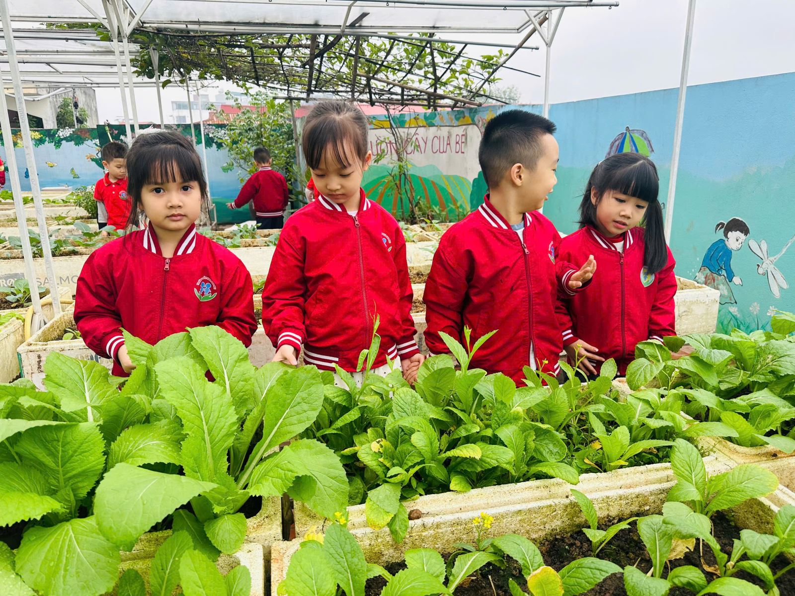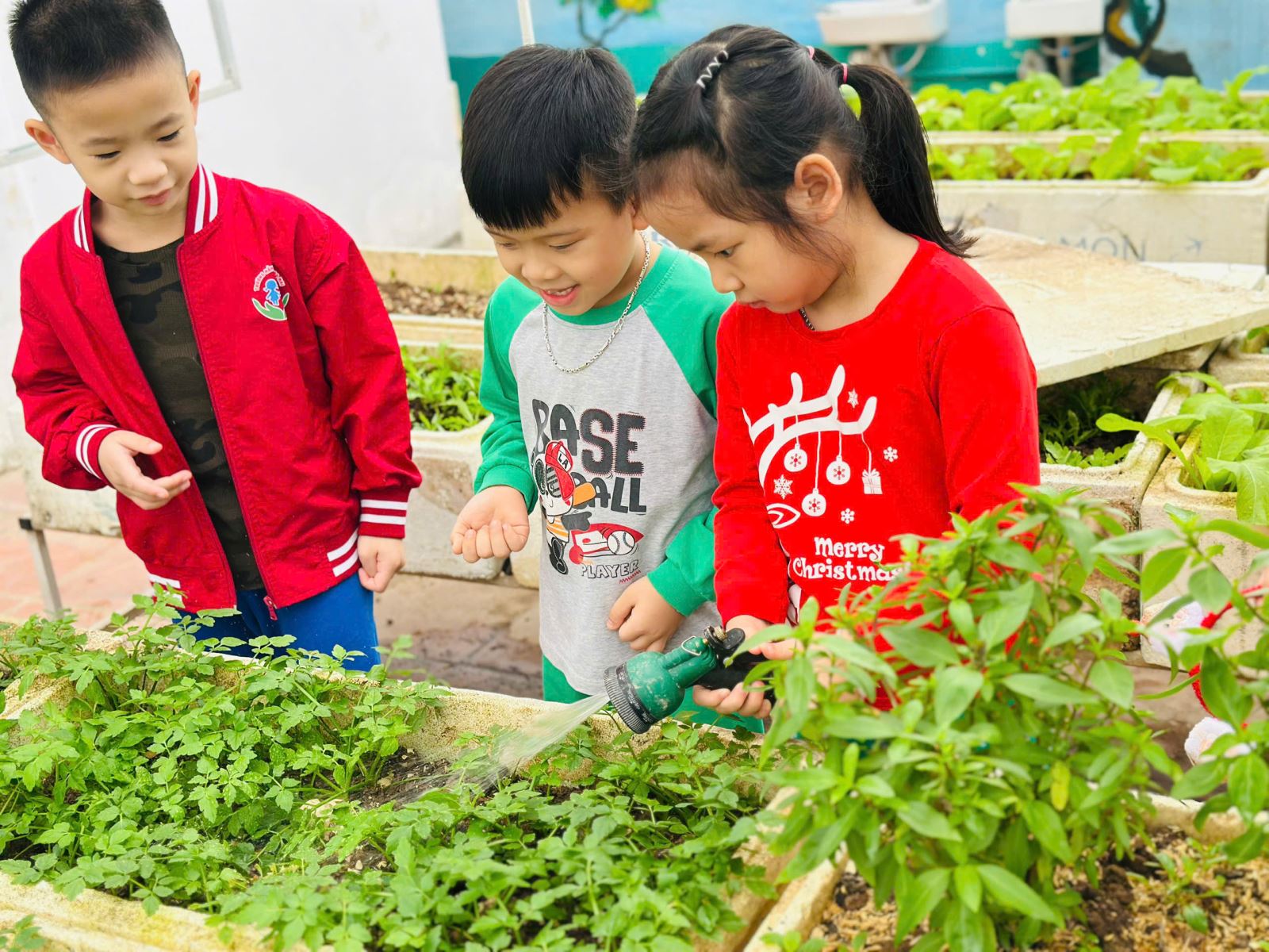 Từ góc vườn rau nhỏ trên tầng 5, mỗi ngày đến lớp lại trở thành một trải nghiệm thú vị đối với các bé. Dưới sự hướng dẫn của cô giáo, trẻ được làm quen với những loại rau quen thuộc, cùng nhau tưới nước, nhổ cỏ, chăm sóc và theo dõi sự phát triển của cây trồng theo từng ngày. Những hoạt động tưởng chừng rất nhỏ ấy lại mang đến cho trẻ niềm vui, sự hứng thú cho trẻ.