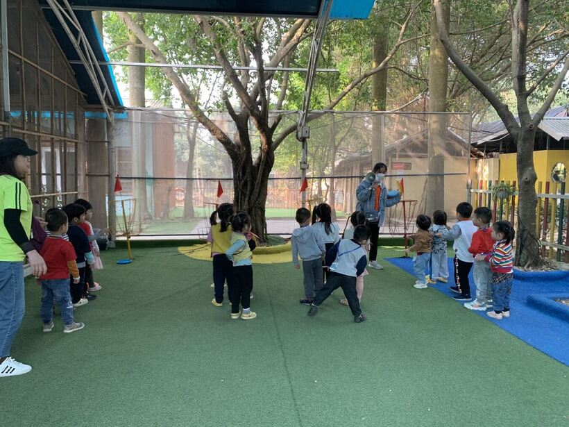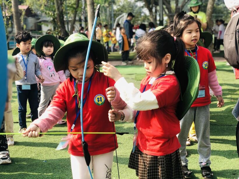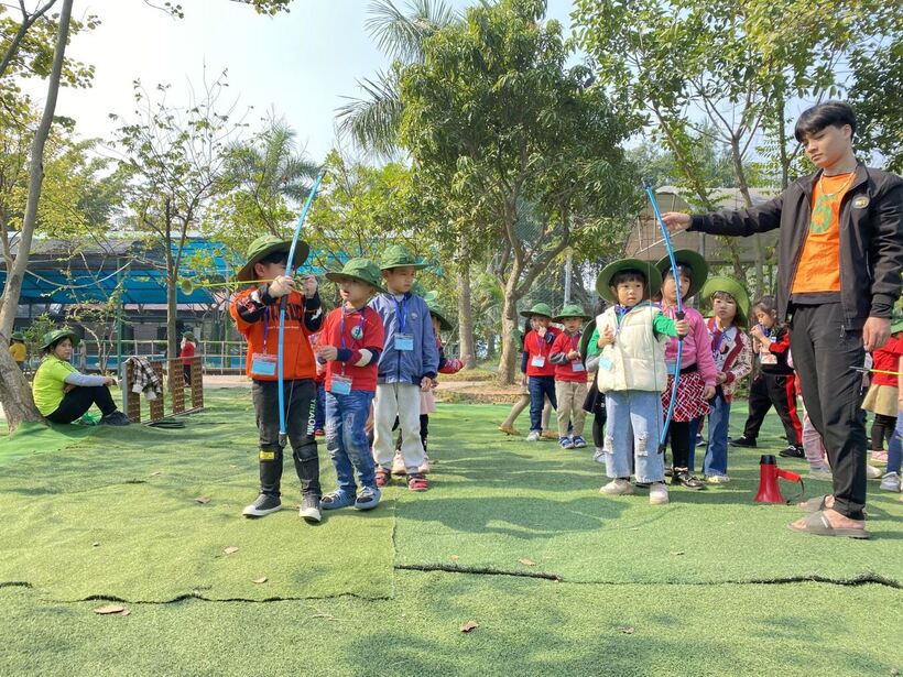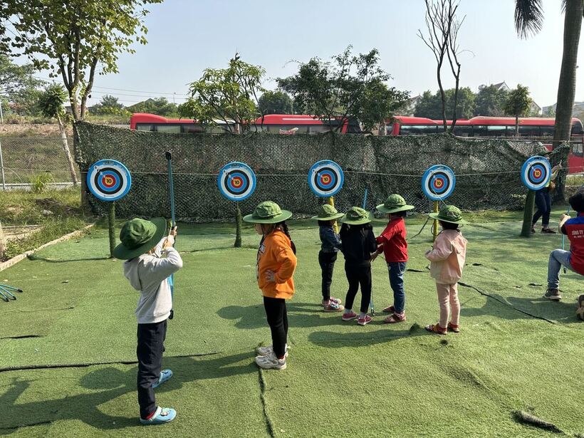Đúng 7h45', những chuyến xe bắt đầu lăn bánh và đưa các con đến với Làng thể thao, Long Biên, Hà Nội. Các con bắt đầu được tham gia những hoạt động trải nghiệm tại đây với biết bao trò chơi hấp dẫn, thú vị. Các anh chị lớn háo hức với trò chơi bắn cung tên, một trò chơi đòi hỏi sự chính xác và tập trung. Các em bé lớp Nhỡ và lớp Bé lại thật thích thú với trò chơi câu cá, trượt cỏ hay ném bóng.