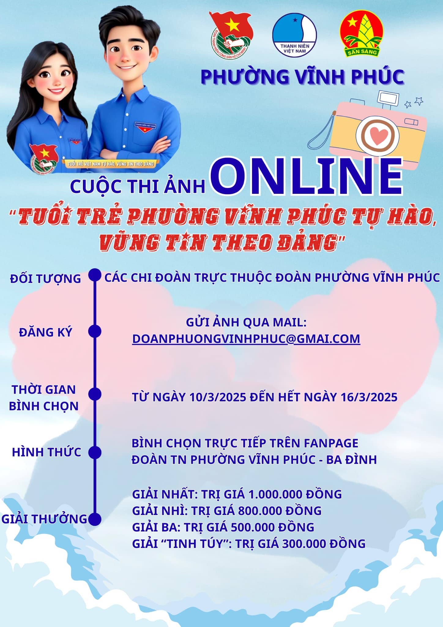 Chào mừng Kỷ niệm 94 năm Ngày thành lập Đoàn Thanh niên Cộng sản Hồ Chí Minh (26/03/1931 - 26/03/2025). Chào mừng 20 năm ngày thành lập phường Vĩnh Phúc (01/4/2005 – 01/4/2025). Ban Thường vụ Đoàn phường Vĩnh Phúc tổ chức cuộc thi ảnh online năm 2025 với chủ đề “Tuổi trẻ phường Vĩnh Phúc tự hào, vững tin theo Đảng”.