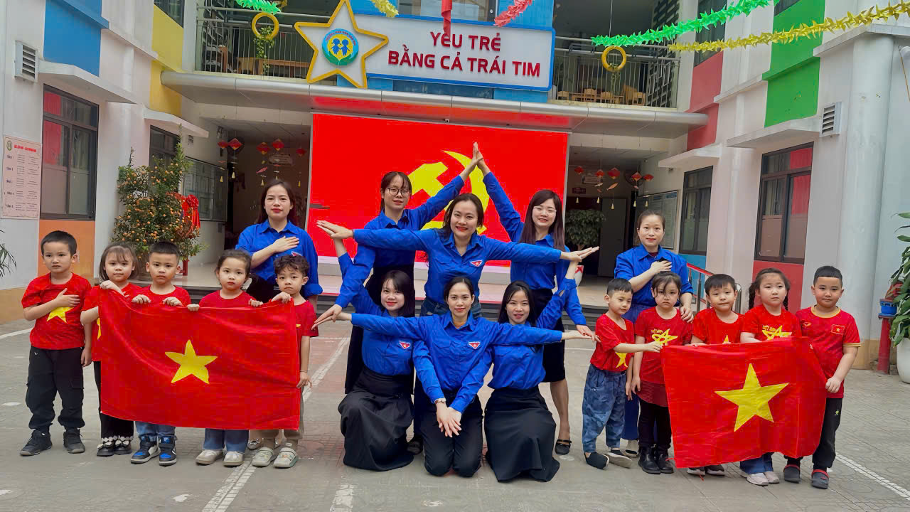 Trong bức ảnh, các cô giáo khoác lên mình màu áo xanh thanh niên, tượng trưng cho sức trẻ, sự cống hiến và lòng nhiệt huyết. Các em nhỏ trong màu áo đỏ sao vàng – màu cờ Tổ quốc, thể hiện niềm tự hào dân tộc ngay từ khi còn thơ bé. Tất cả cùng nhau tạo nên một hình ảnh đẹp, thể hiện sự đoàn kết, niềm tin son sắt vào sự lãnh đạo của Đảng, hướng đến một tương lai tươi sáng.