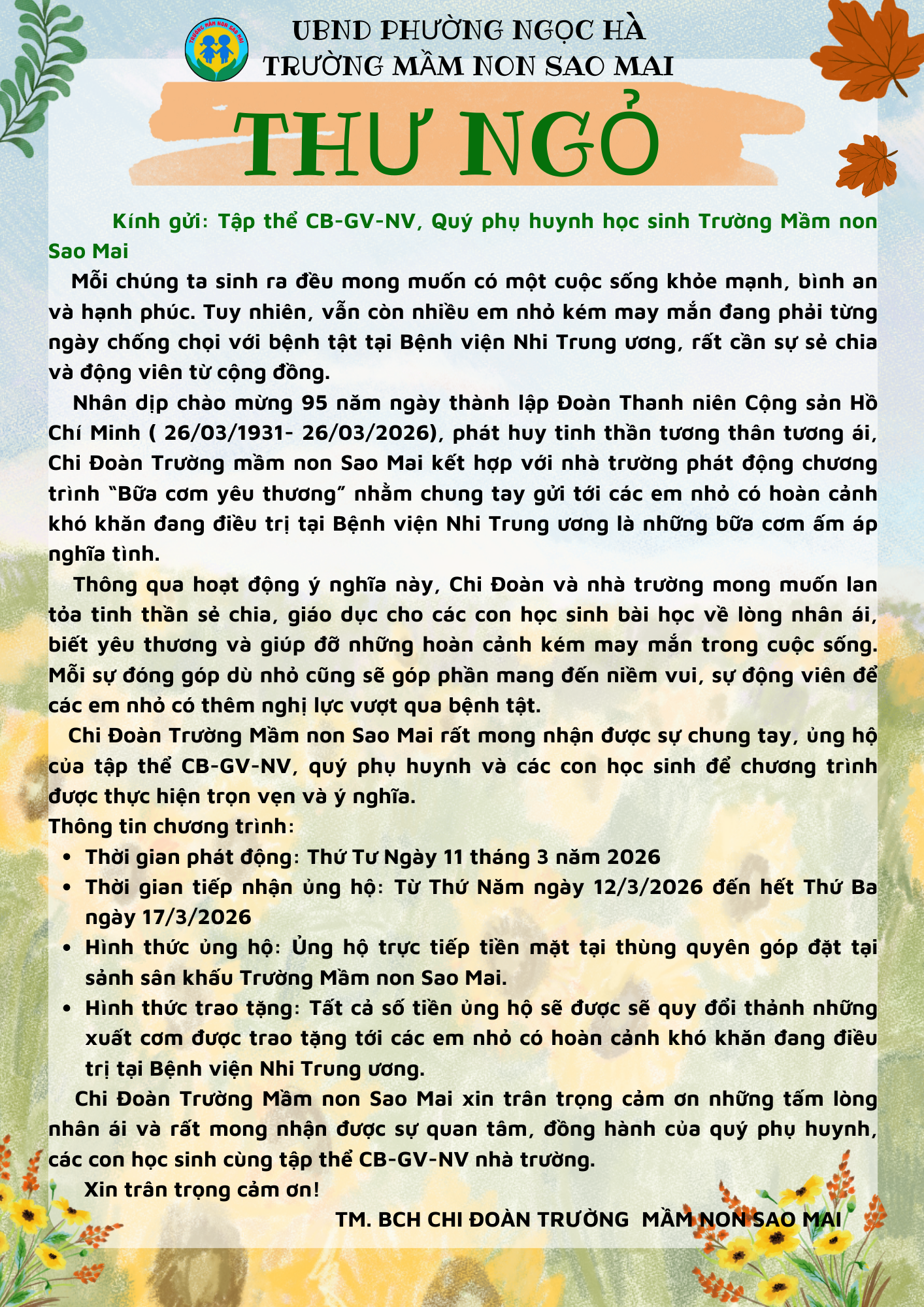Chi Đoàn Trường Mầm non Sao Mai phát động chương trình thiện nguyện “Bữa cơm yêu thương” - Lan tỏa tinh thần sẻ chia tới các em nhỏ có hoàn cảnh khó khăn tại Bệnh viện Nhi Trung Ương.