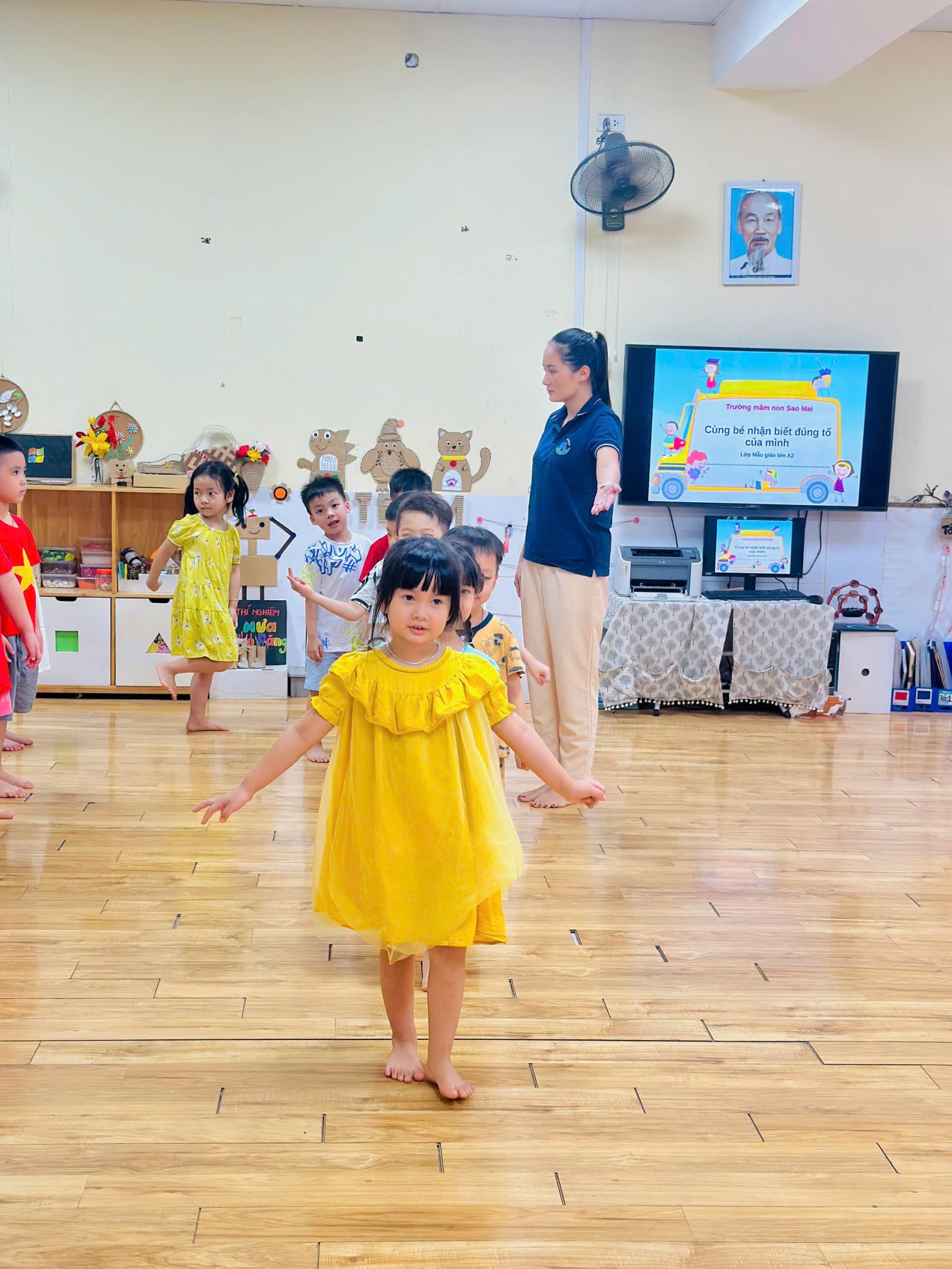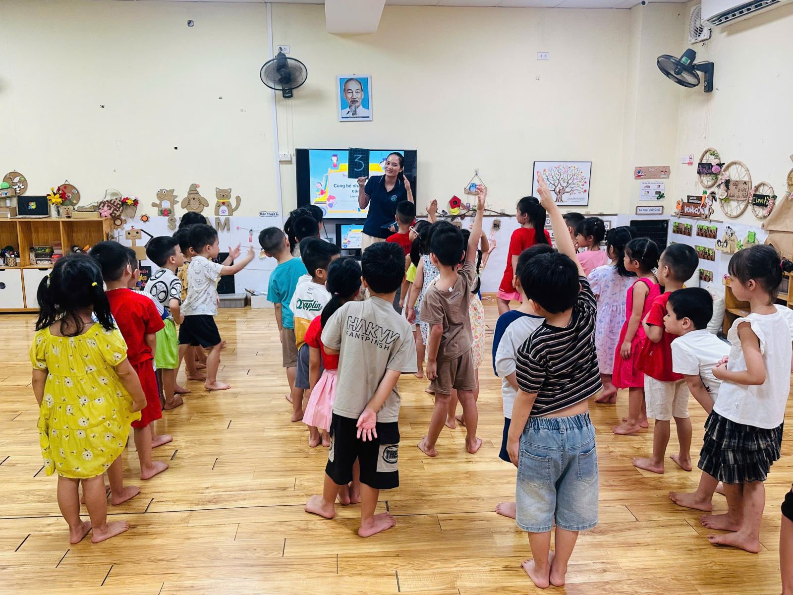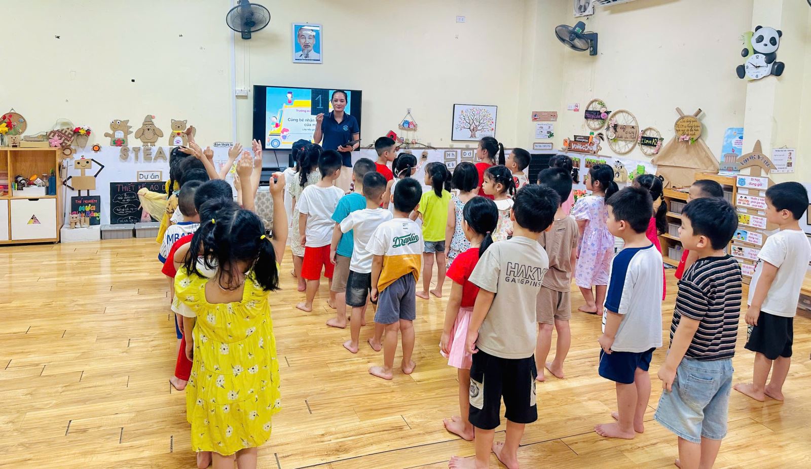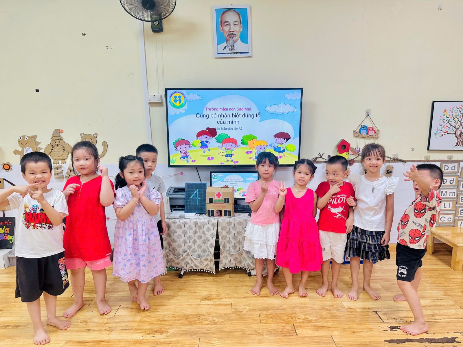 Để không khí trở nên sôi nổi hơn với các trò chơi giúp các con nhớ tổ của mình hơn. Bạn nào cũng rất hào hứng giơ tay và nhanh chân di chuyển về đúng tổ đã được phân công. Tiếng bước chân rộn ràng, tiếng cười giòn tan hòa cùng ánh mắt háo hức của các bé khiến lớp học trở nên thật vui nhộn và đầy năng lượng.