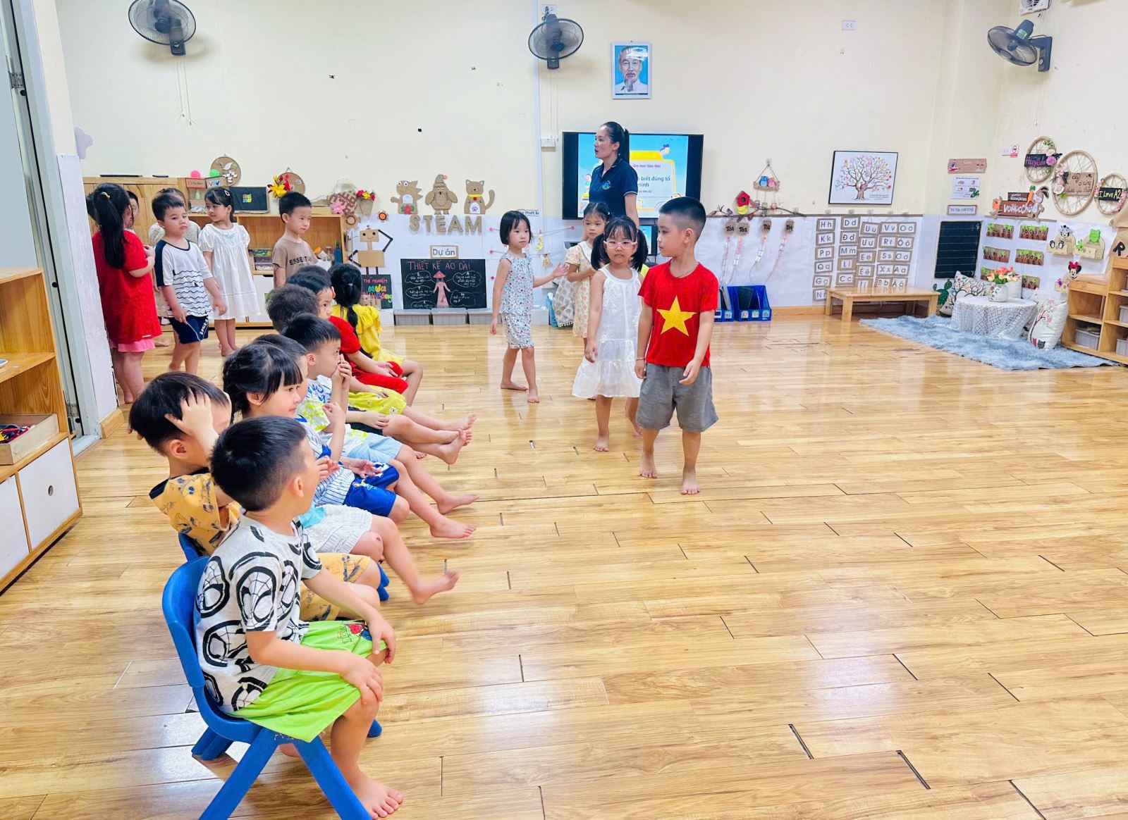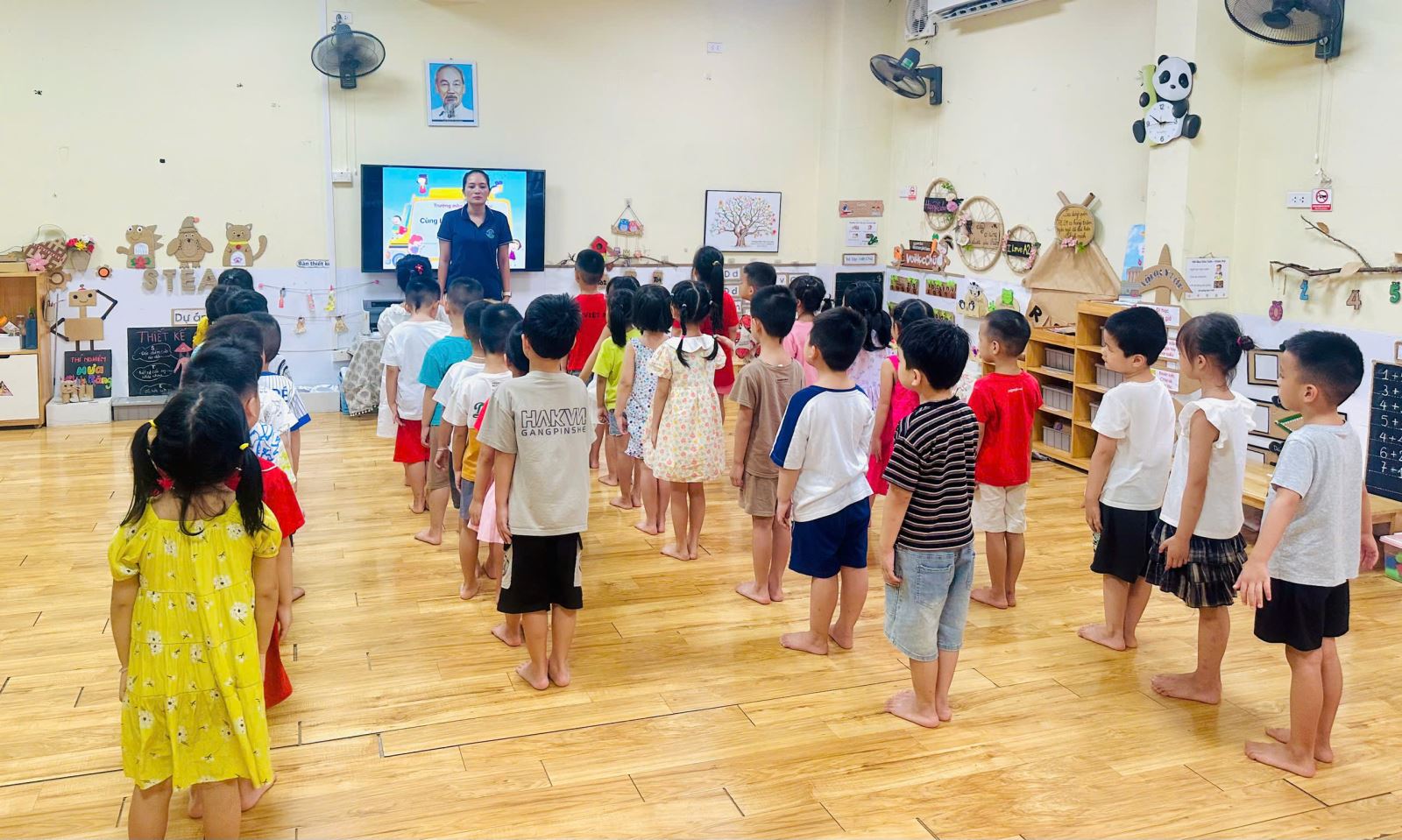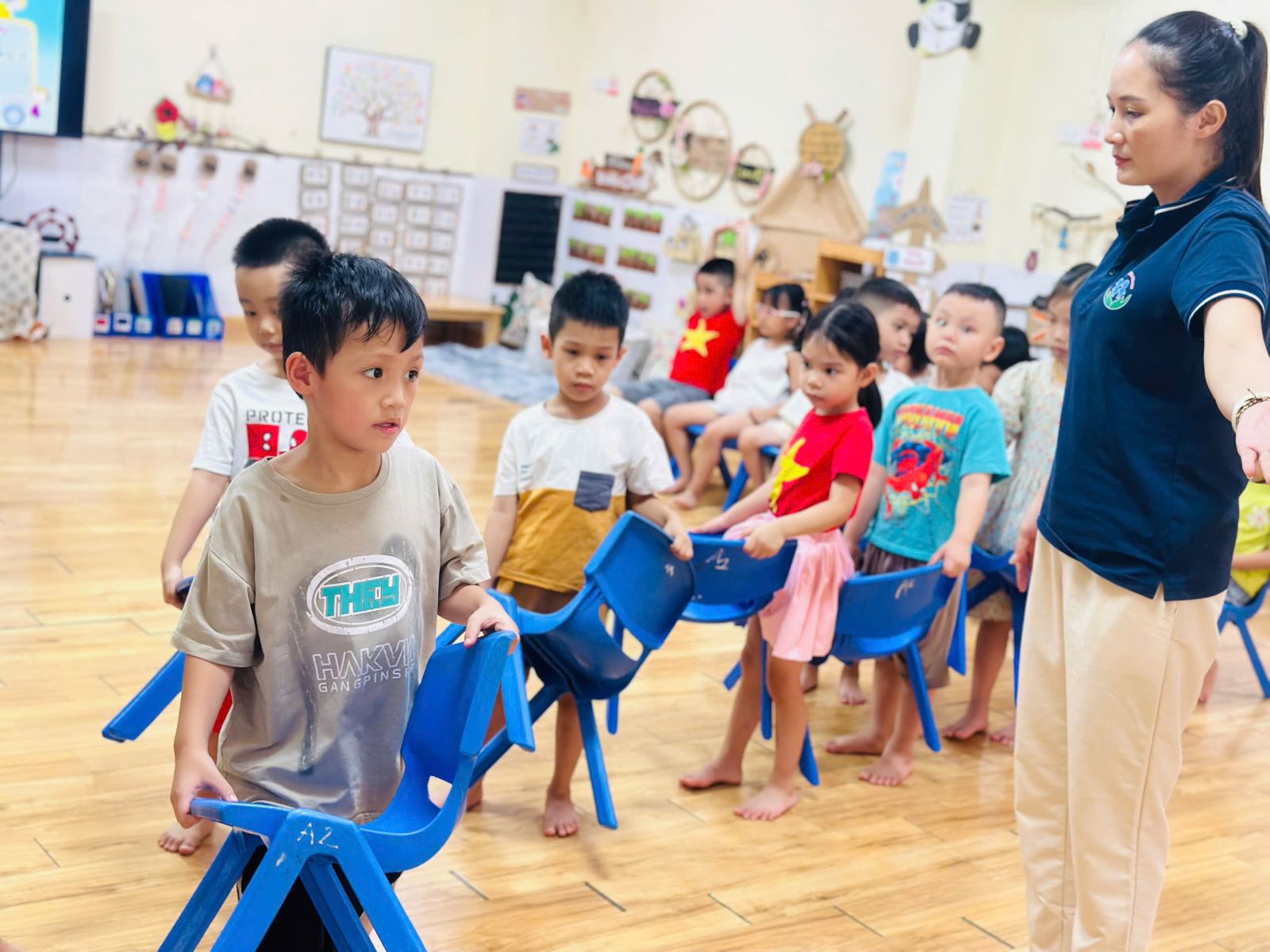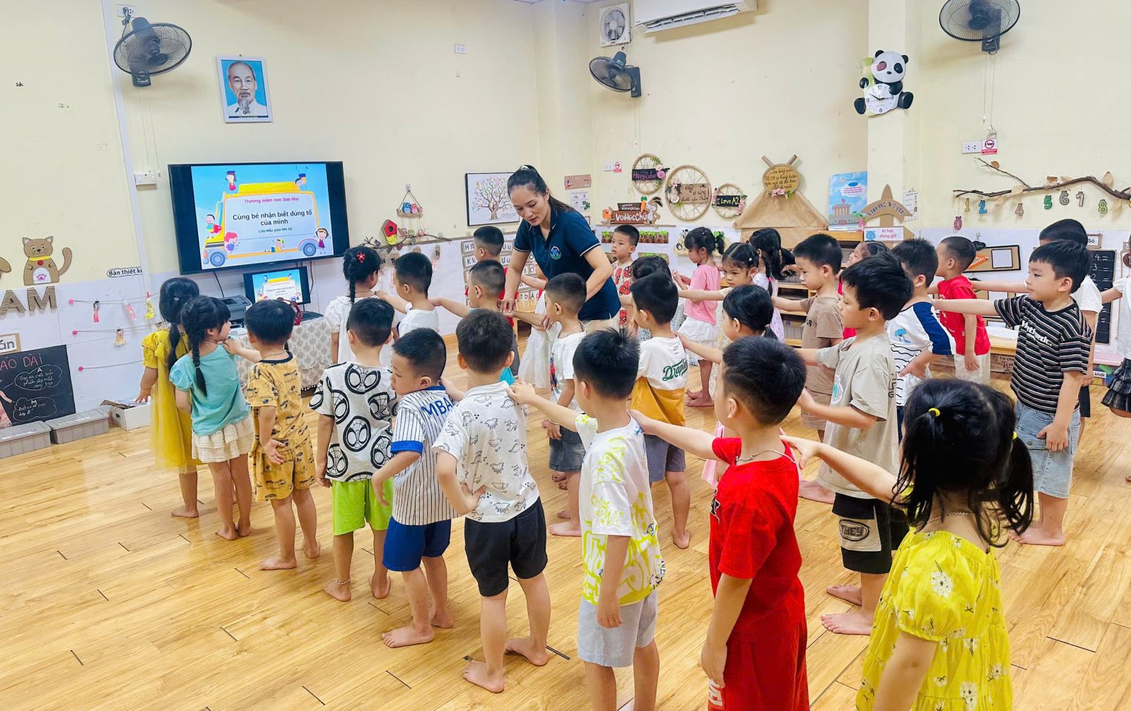 Để không khí trở nên sôi nổi hơn với các trò chơi giúp các con nhớ tổ của mình hơn. Bạn nào cũng rất hào hứng giơ tay và nhanh chân di chuyển về đúng tổ đã được phân công. Tiếng bước chân rộn ràng, tiếng cười giòn tan hòa cùng ánh mắt háo hức của các bé khiến lớp học trở nên thật vui nhộn và đầy năng lượng.