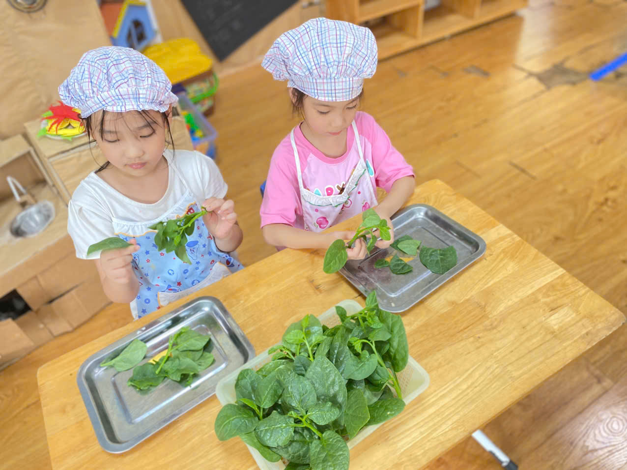 Khi nhặt rau, trẻ được biến mình thành những cô đầu bếp nhí, biết yêu lao động và trân trọng thực phẩm.