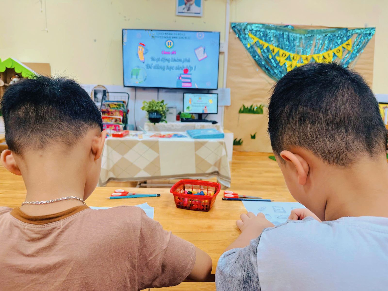 Tại lớp học, các bé đã được cô giáo giới thiệu và trực tiếp quan sát, cầm nắm những vật dụng quen thuộc của các anh chị tiểu học như: bảng con, vở ô ly, bút mực, bút chì, hộp bút, ba lô, thước kẻ... Mỗi đồ dùng được giới thiệu như một người bạn mới, cùng các bé chuẩn bị bước vào chặng đường học tập mới mẻ phía trước.
