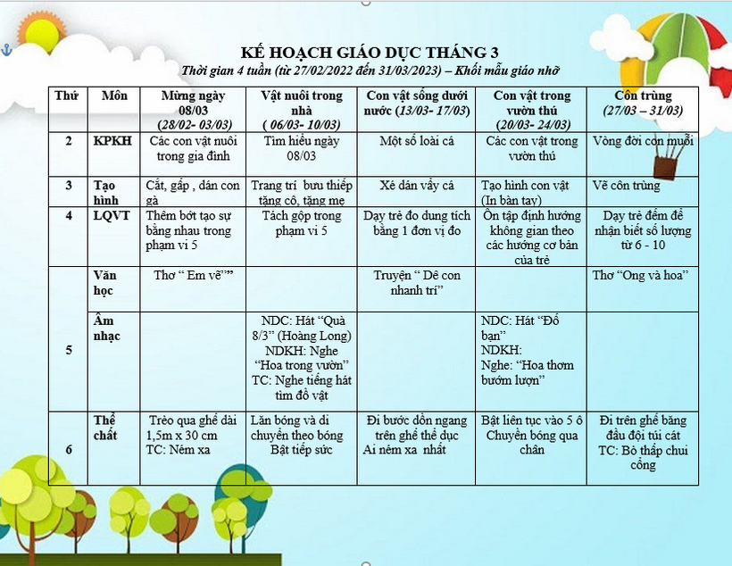 Thời khóa biểu khối Mẫu giáo Nhỡ tháng 3/2023