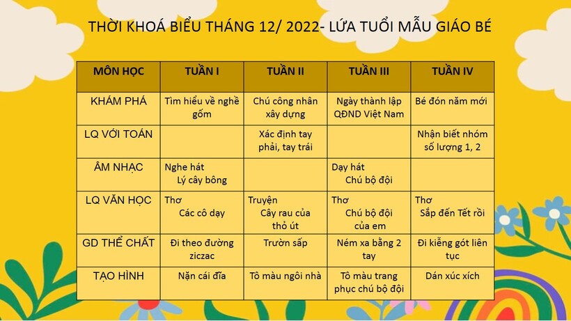 Thời khoá biểu tháng 12/2022- Lứa tuổi mẫu giáo bé