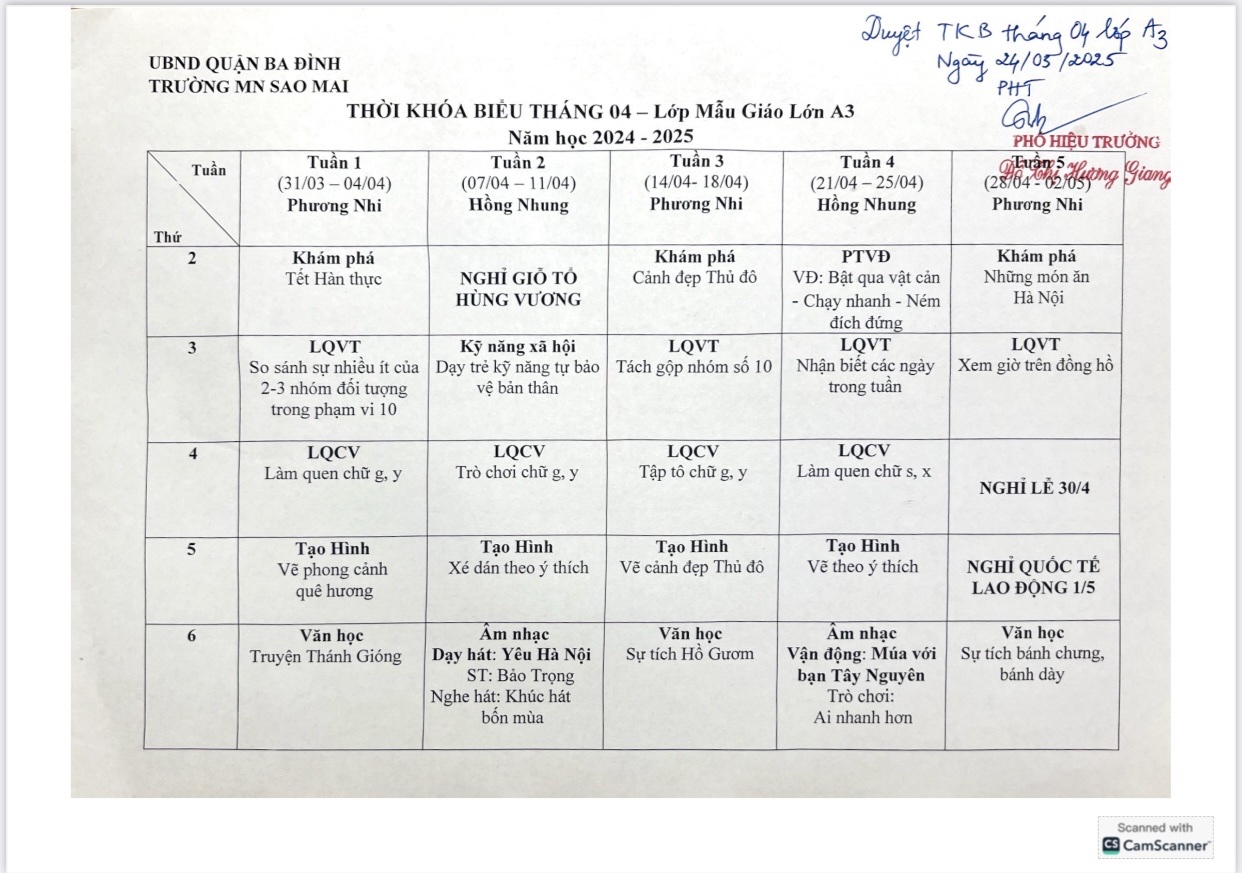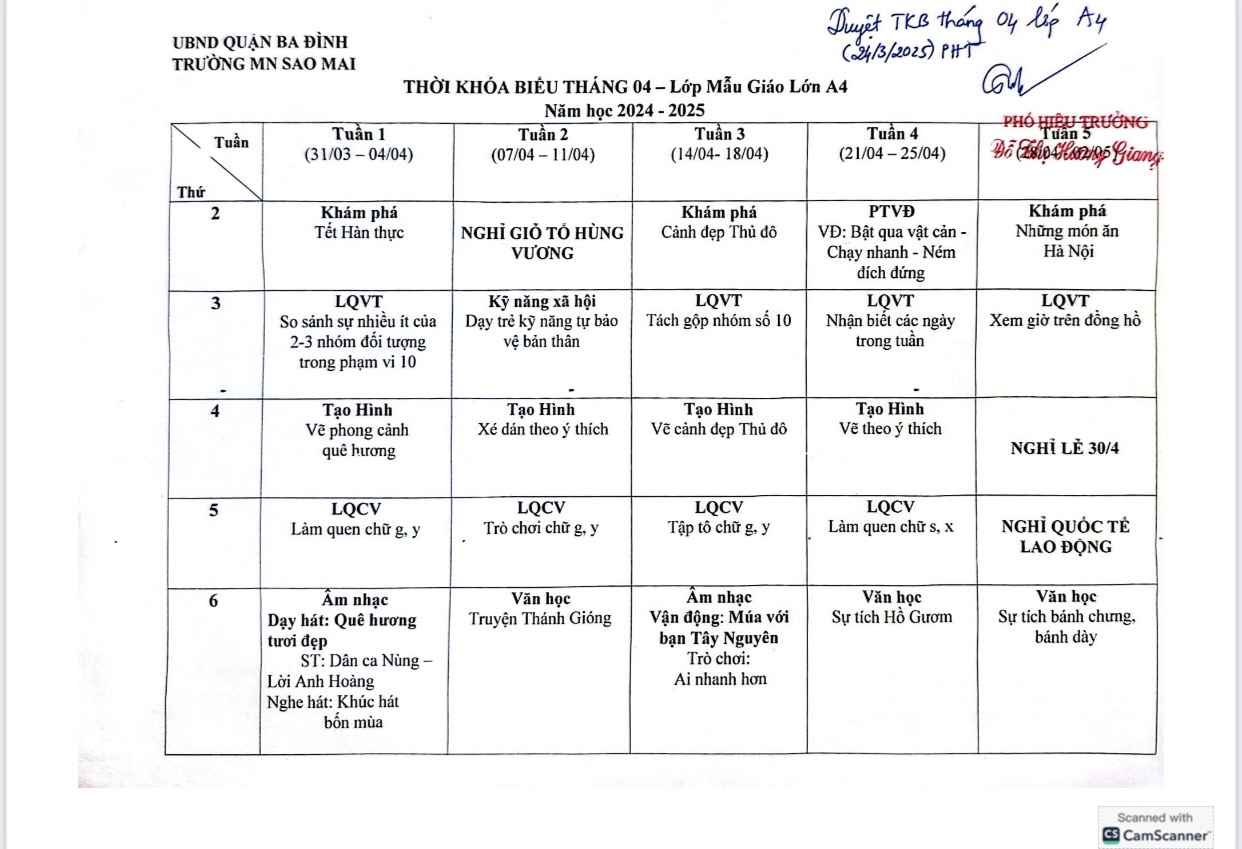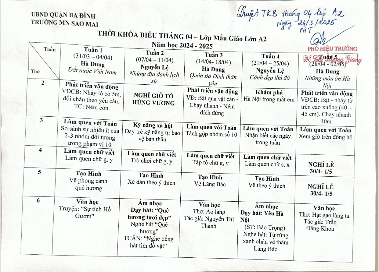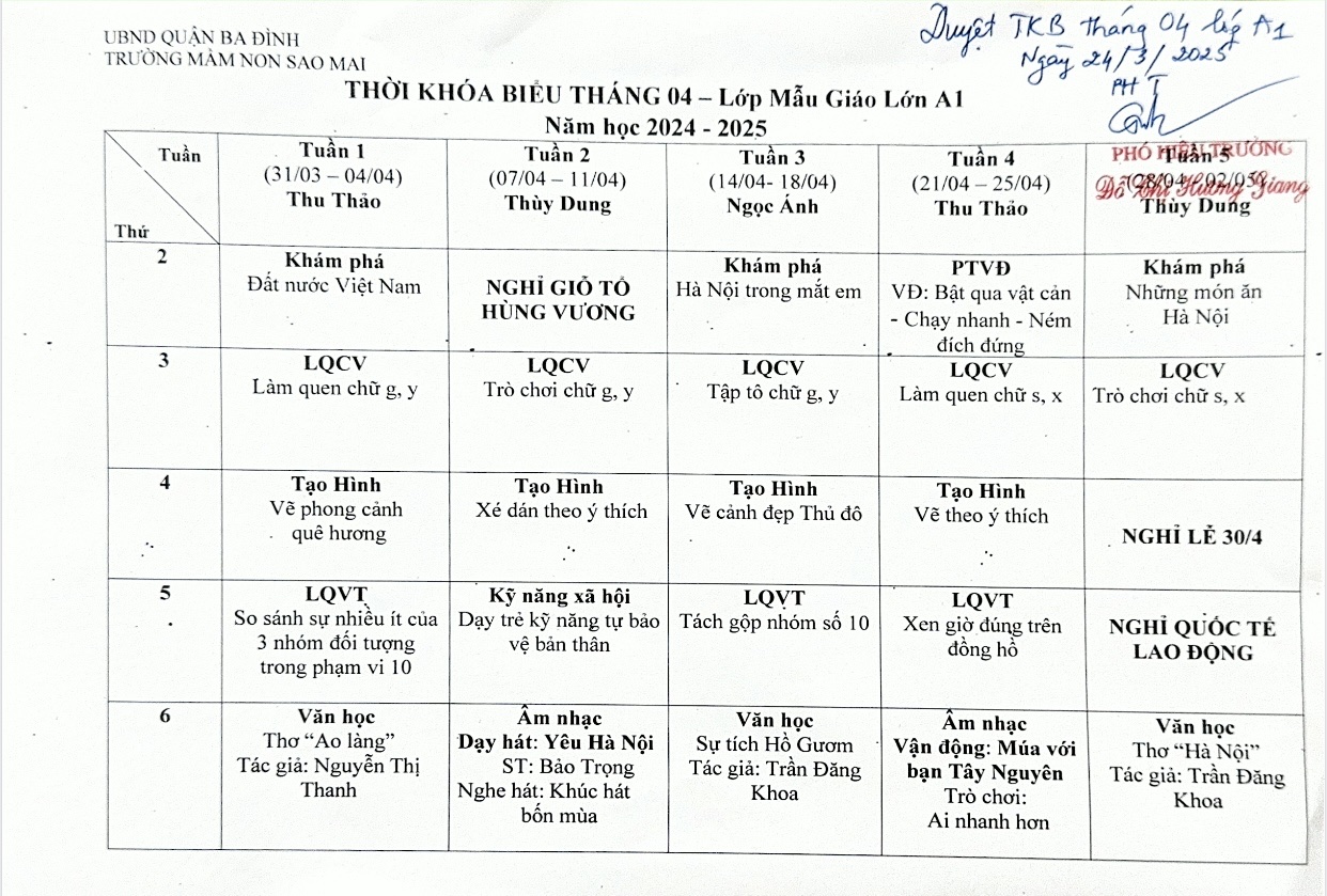 Thời khóa biểu tháng 4 năm 2025 khối mẫu giáo lớn