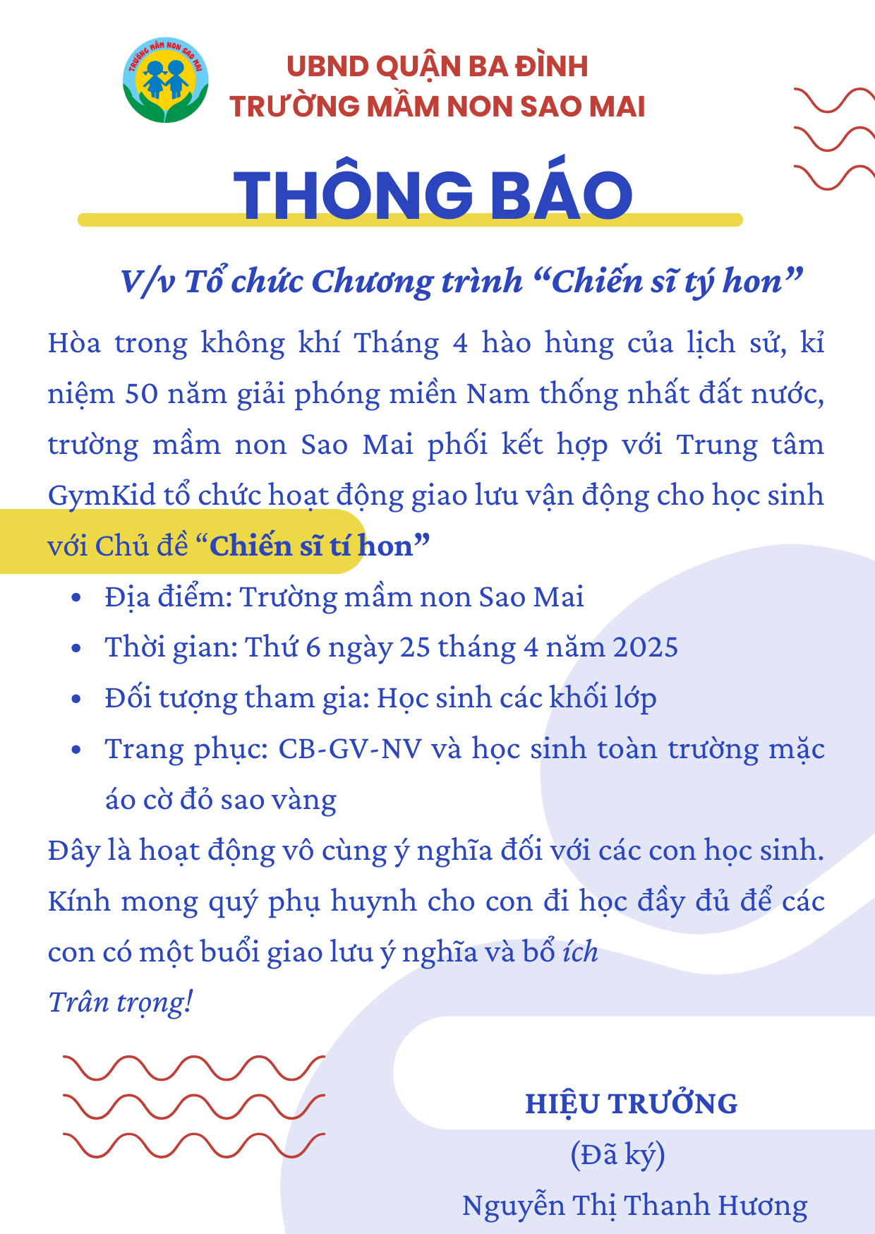 Thông báo tổ chức Chương trình "Chiến sĩ tý hon" của Trường mầm non Sao Mai