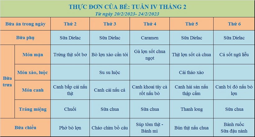Thực đơn cho bé tuần từ 20/2 đến 24/2/2023.