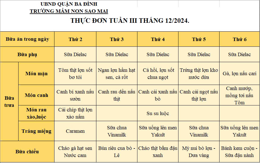 Thực đơn cho trẻ tuần 3 tháng 12 ( Từ 16/12 đến 20/12)