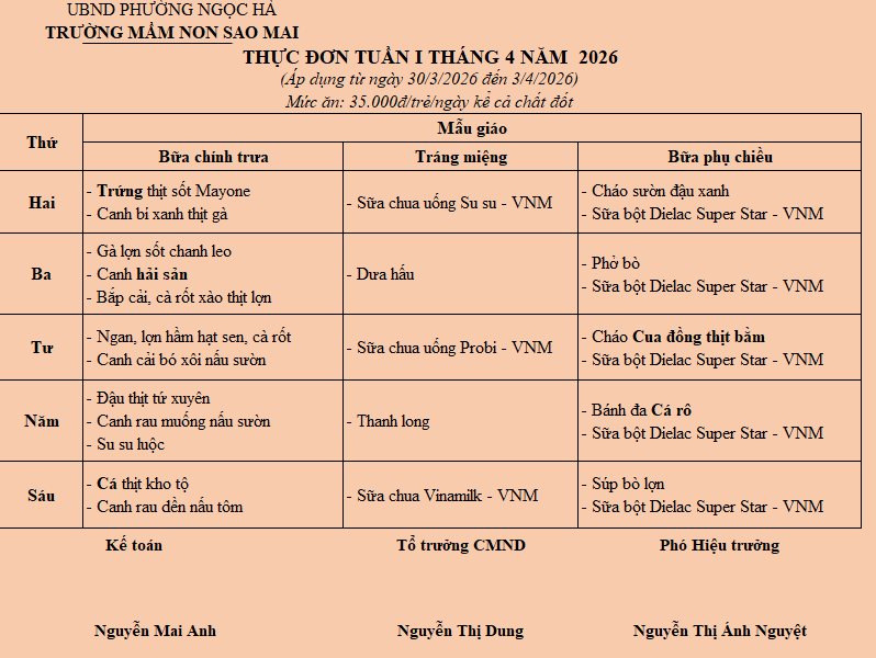 Thực đơn tuần 1 tháng 4/2026 (từ ngày 30/3 - 3/4/2026) của Trường Mầm non Sao Mai được xây dựng đa dạng, cân đối dinh dưỡng, đảm bảo các bé được cung cấp đầy đủ năng lượng cho một ngày học tập và vui chơi. Các món ăn được chế biến từ nguyên liệu tươi sạch, phù hợp với lứa tuổi mầm non, giúp bé ăn ngon miệng và phát triển khỏe mạnh.