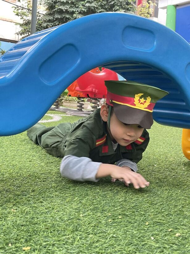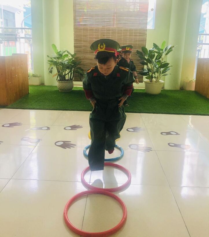 Các bé còn được tham gia trải nghiệm "Bé tập làm chiến sĩ" với các bài tập mô phỏng hình thức luyện tập của các chú bộ đội qua một số hoạt động vừa giúp các con rèn luyện sức khỏe, sự khéo léo, vừa giúp các con hình dung ra hoạt động luyện tập vất vả của các chú bộ đội hàng ngày.