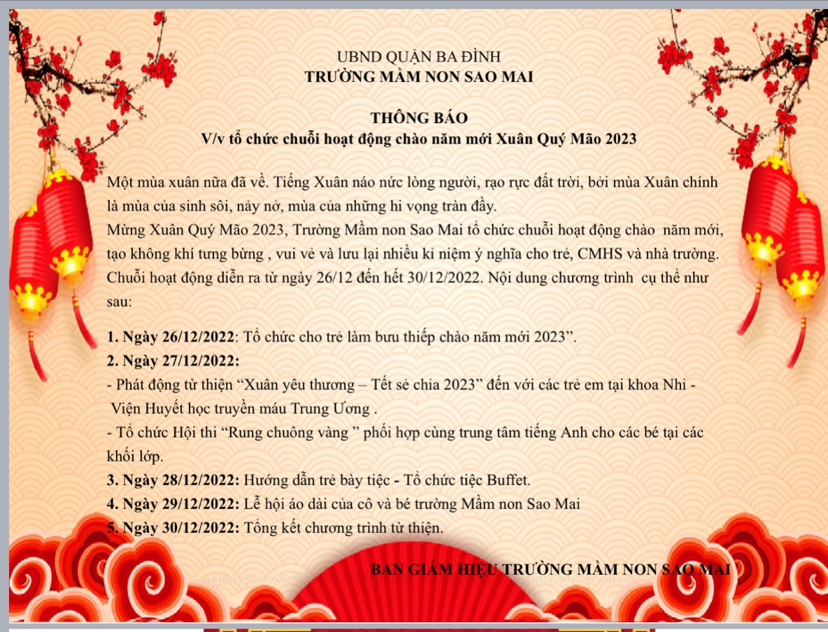 Mừng Xuân Quý Mão 2023, Trường Mầm non Sao Mai tổ chức chuỗi hoạt động chào năm mới, tạo không khí tưng bừng, vui vẻ và lưu lại những kỷ niệm đẹp ý nghĩa cho trẻ, cha mẹ học sinh và nhà trường.