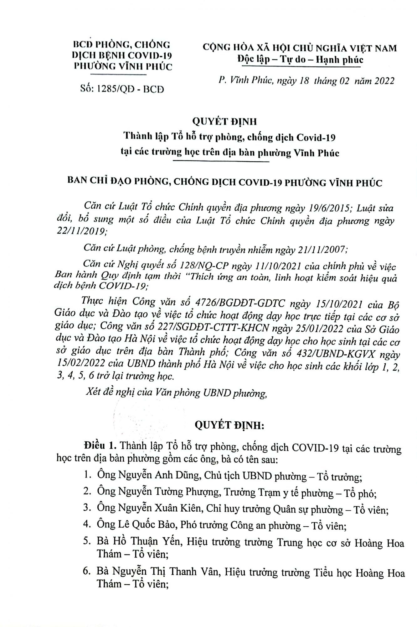 Ngày 18/02/2022, Ban chỉ đạo phòng, chống dịch Covid-19 UBND phường Vĩnh Phúc ban hành Quyết định số 1285/QĐ-BCĐ về việc thành lập tổ hỗ trợ phòng, chống dịch Covid-19 tại các trường học trên địa bàn phường Vĩnh Phúc. Đây là sự hỗ trợ cần thiết và vô cùng quan trọng thể hiện sự quan tâm của chính quyền địa phương đối với các nhà trường nói riêng và với sự nghiệp giáo dục nói chung. Toàn văn Quyết định như sau: