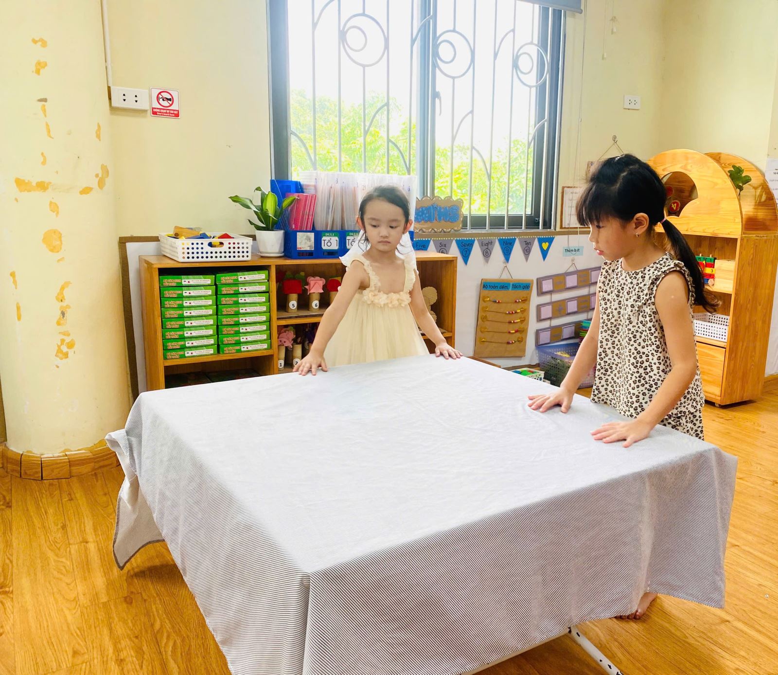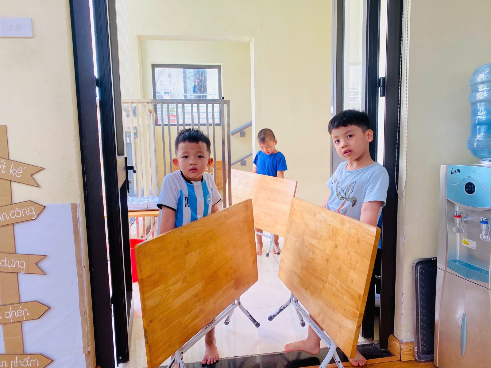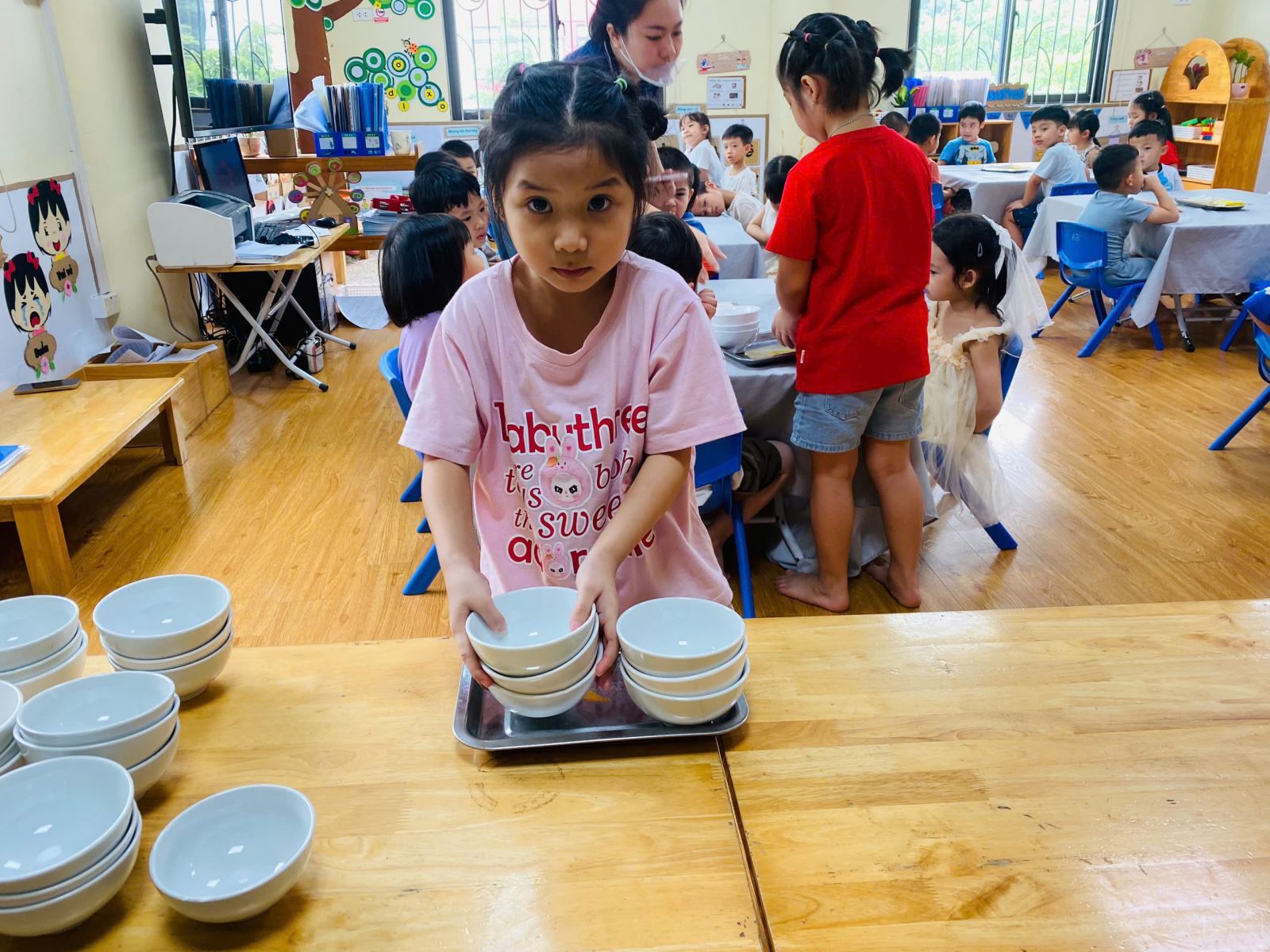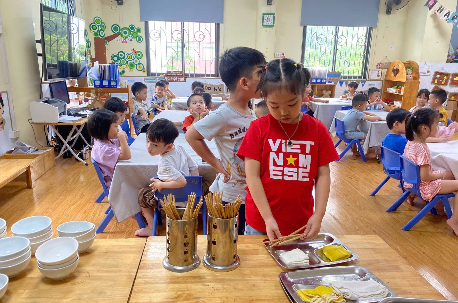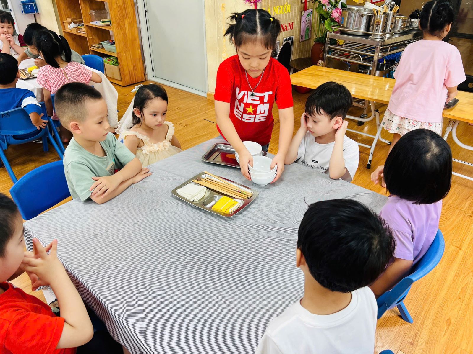 Bữa ăn trưa nay tại lớp học A3 đã trở nên khác lạ. Những chiếc bàn nhỏ được kê gọn gàng, phủ khăn xinh xắn, bát đĩa được chuẩn bị chu đáo. Trẻ háo hức cùng cô tham gia sắp xếp chỗ ngồi, chuẩn bị bàn ăn. Có bạn khéo léo bày thìa, xếp đũa; có bạn lại vui vẻ xếp bát, xếp khay, ai nấy đều cảm thấy mình như một thành viên quan trọng trong “ngôi nhà A3”.