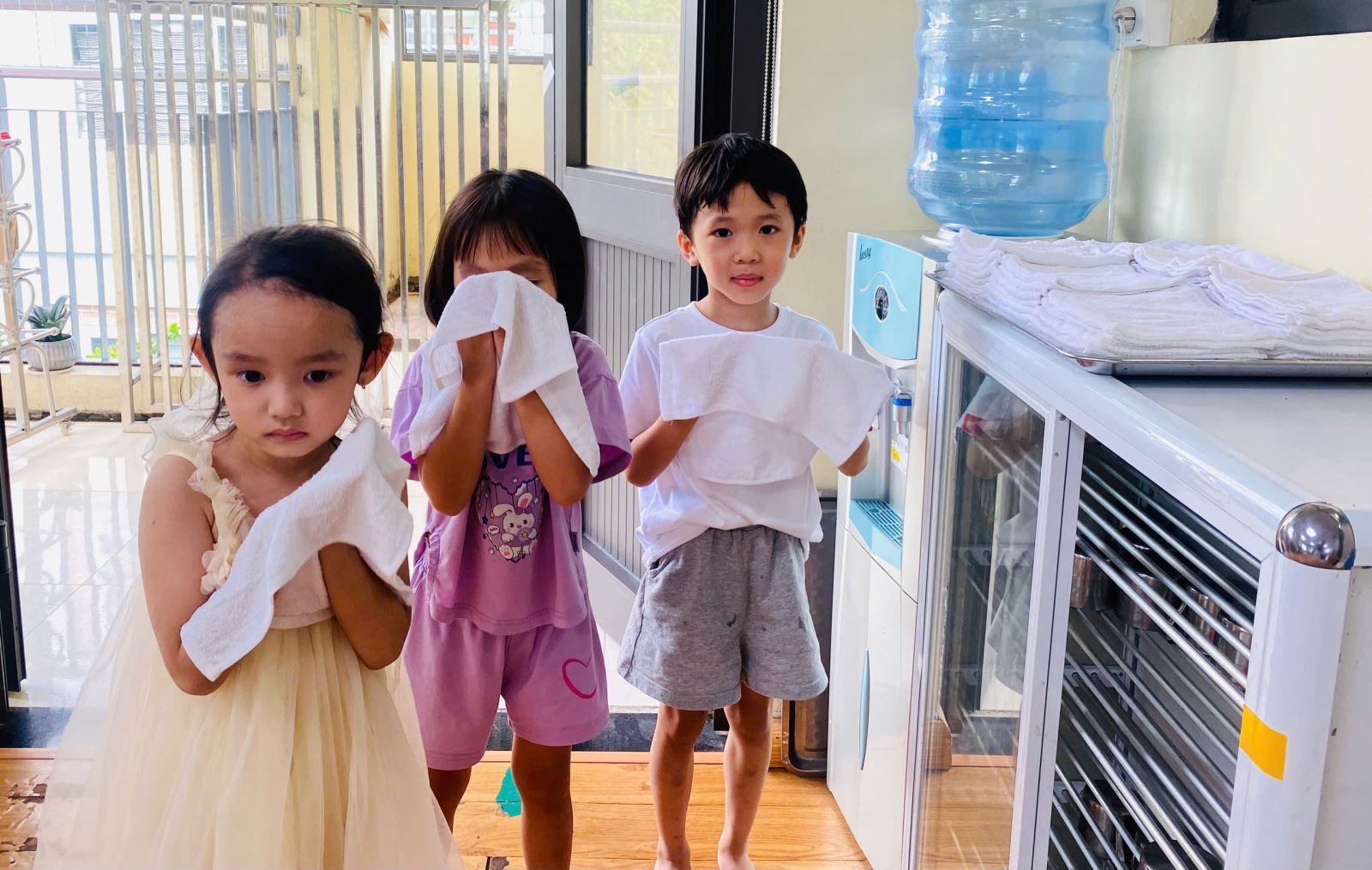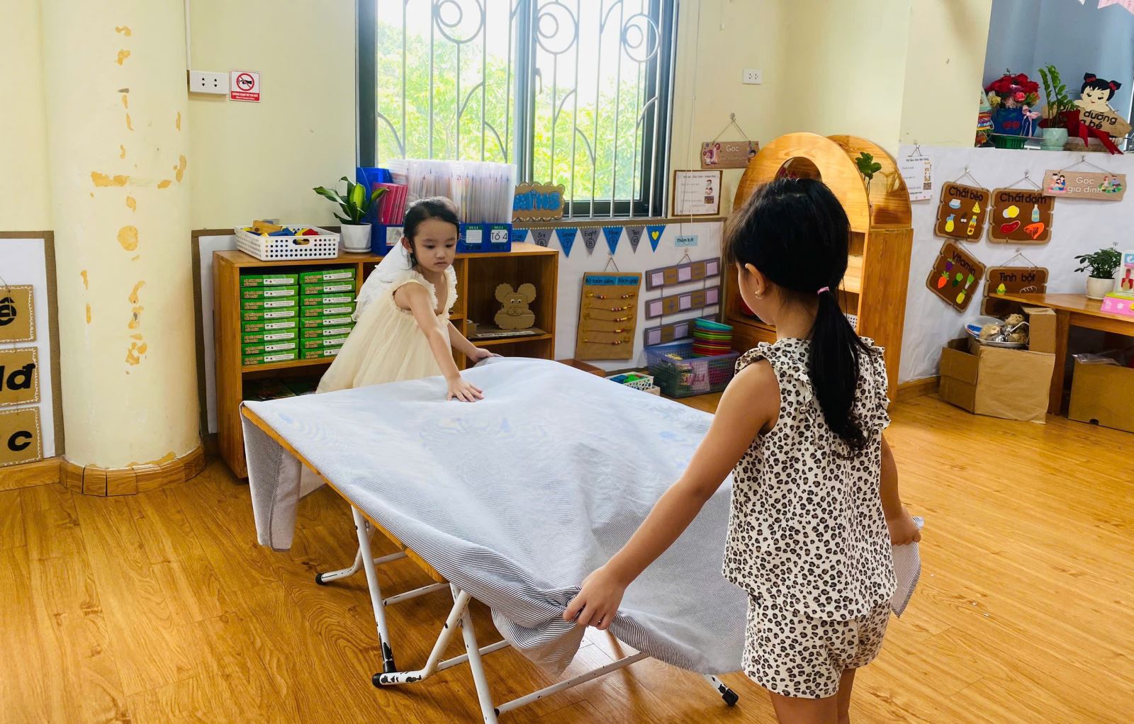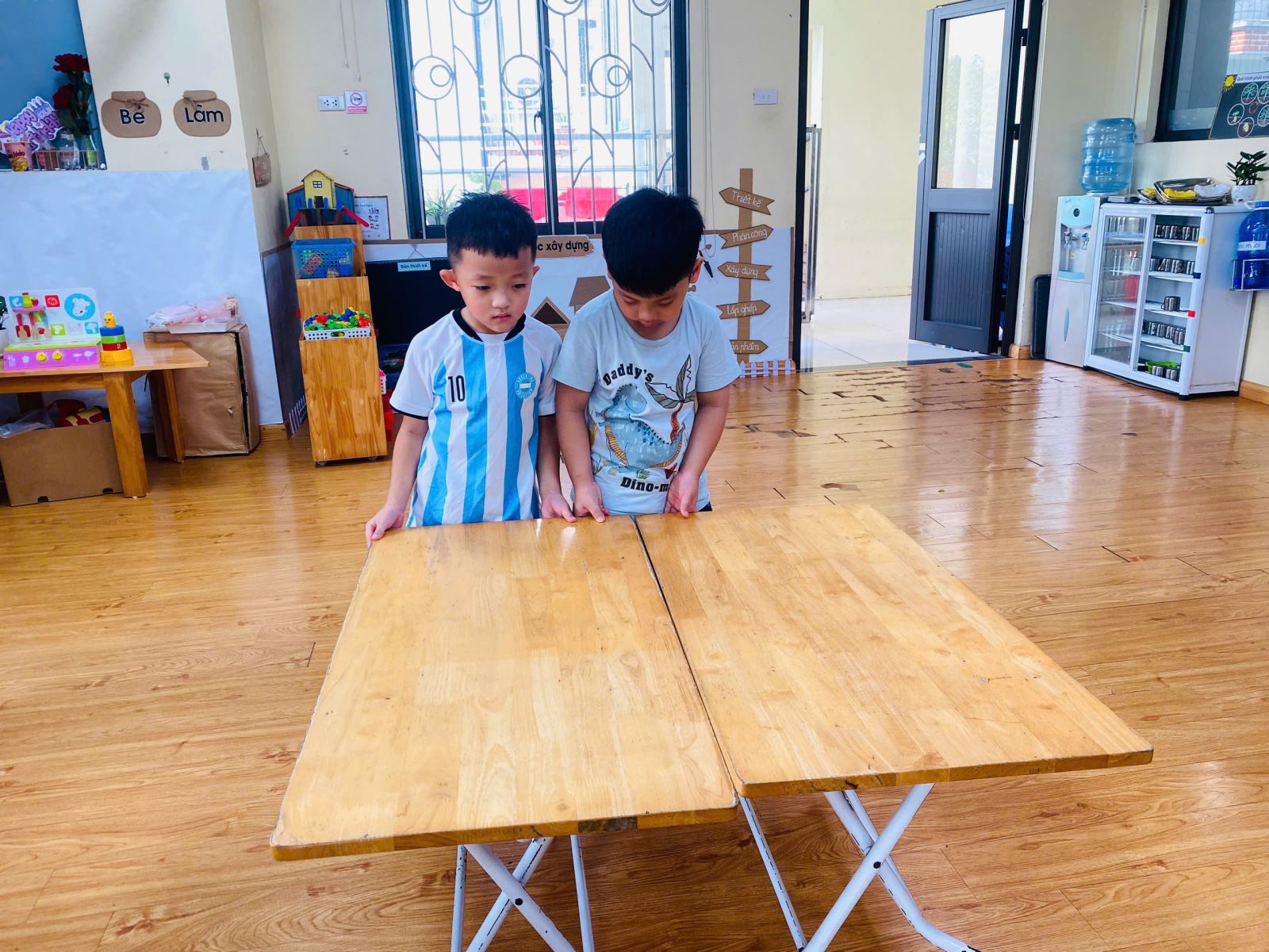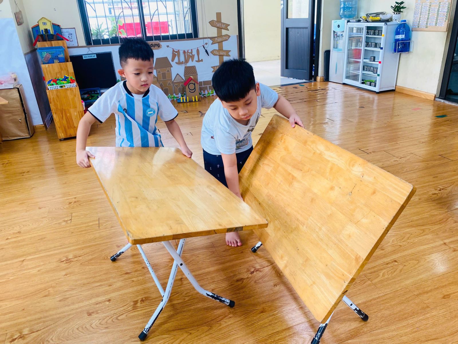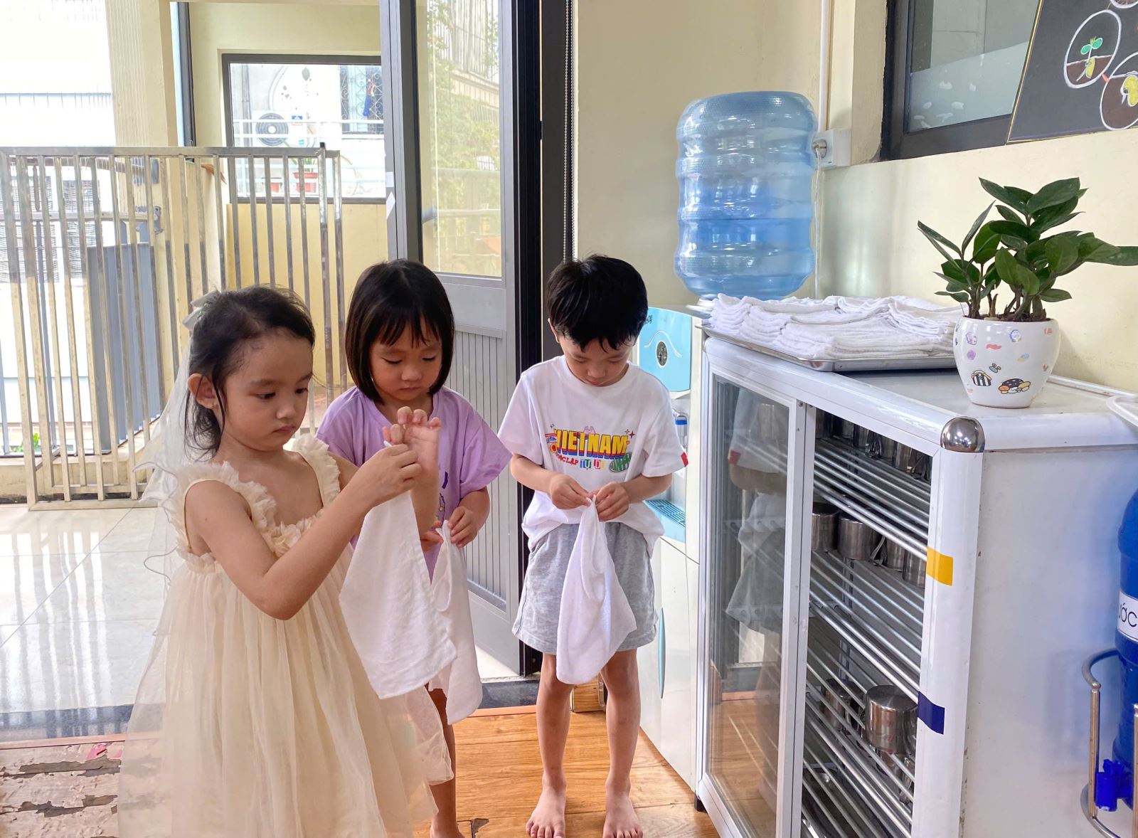 Bữa ăn trưa nay tại lớp học A3 đã trở nên khác lạ. Những chiếc bàn nhỏ được kê gọn gàng, phủ khăn xinh xắn, bát đĩa được chuẩn bị chu đáo. Trẻ háo hức cùng cô tham gia sắp xếp chỗ ngồi, chuẩn bị bàn ăn. Có bạn khéo léo bày thìa, xếp đũa; có bạn lại vui vẻ xếp bát, xếp khay, ai nấy đều cảm thấy mình như một thành viên quan trọng trong “ngôi nhà A3”.