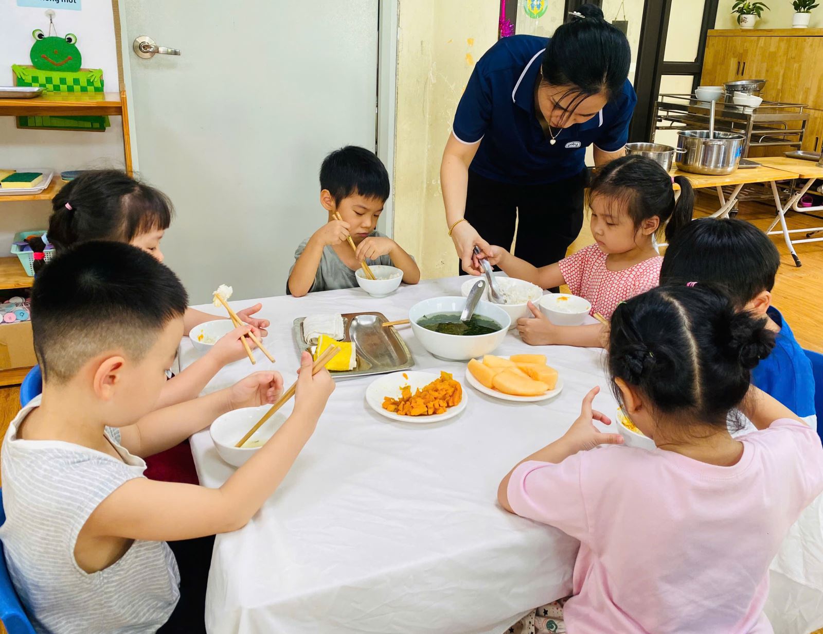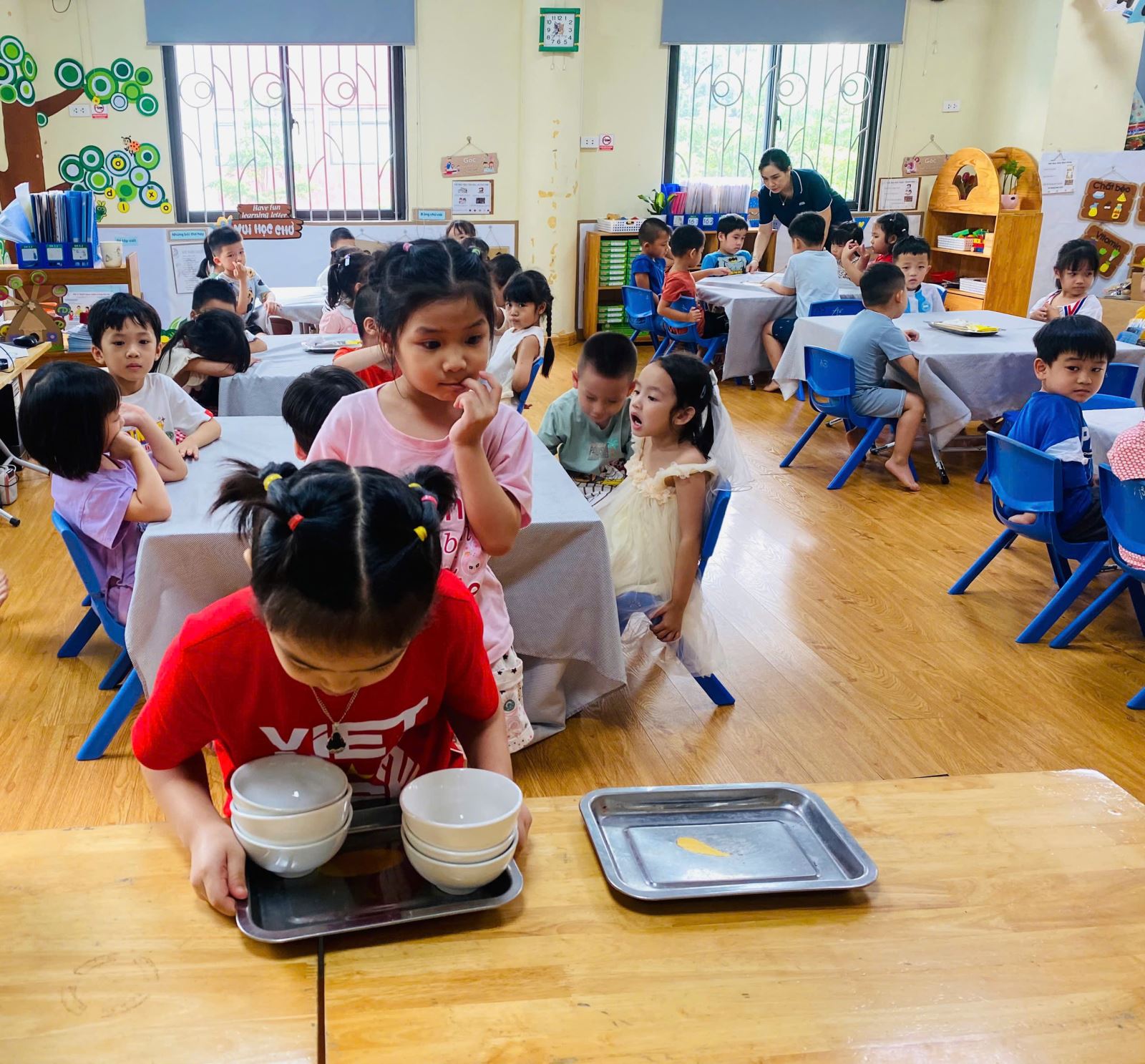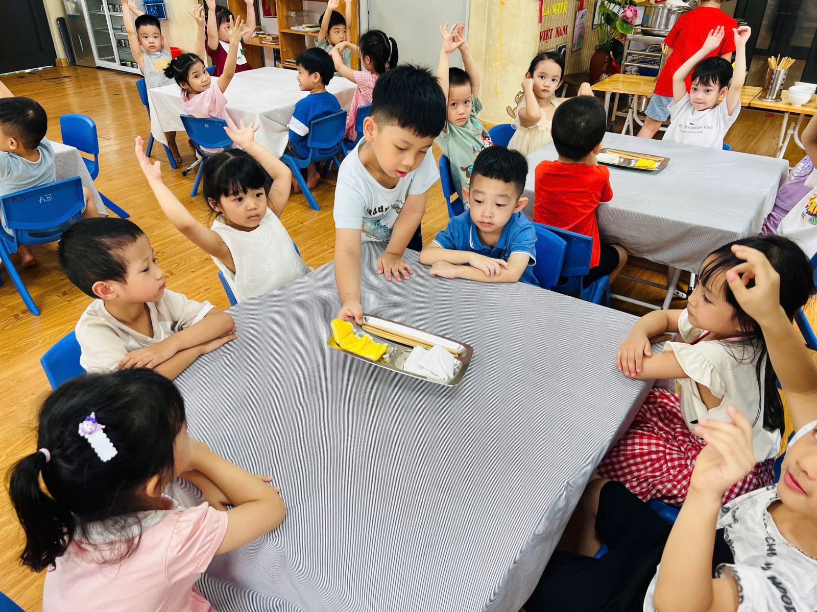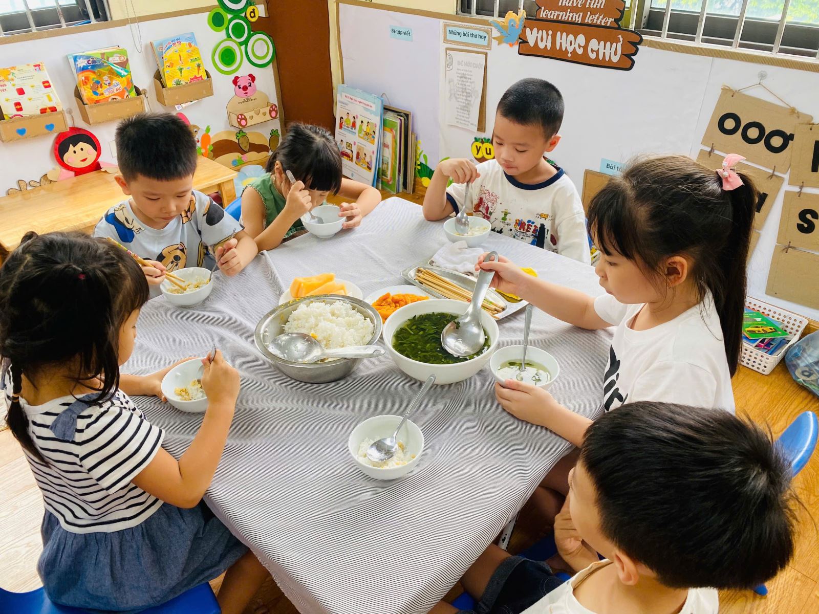 Khi bữa ăn bắt đầu, không khí rộn ràng mà vẫn đầy ấm áp. Trẻ được cô hướng dẫn cách mời cơm, cách ngồi ngay ngắn, tự xúc ăn gọn gàng và biết nhường nhịn, chia sẻ với bạn bên cạnh. Những tiếng cười giòn tan vang lên khi các bạn nhỏ cùng nhau thưởng thức món ăn ngon miệng, vừa ăn vừa trò chuyện. Bữa cơm ấy không chỉ đơn thuần là lúc ăn uống mà còn trở thành khoảng thời gian ý nghĩa để các con học kỹ năng sống, học cách quan tâm và yêu thương nhau.