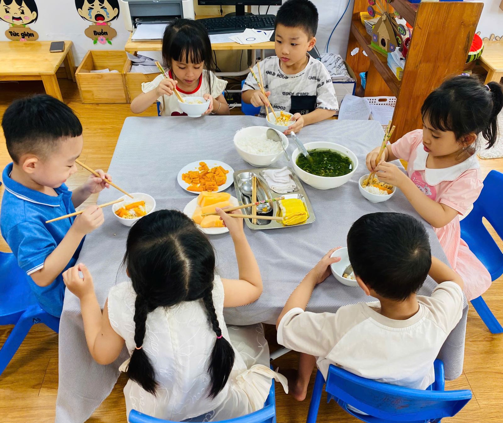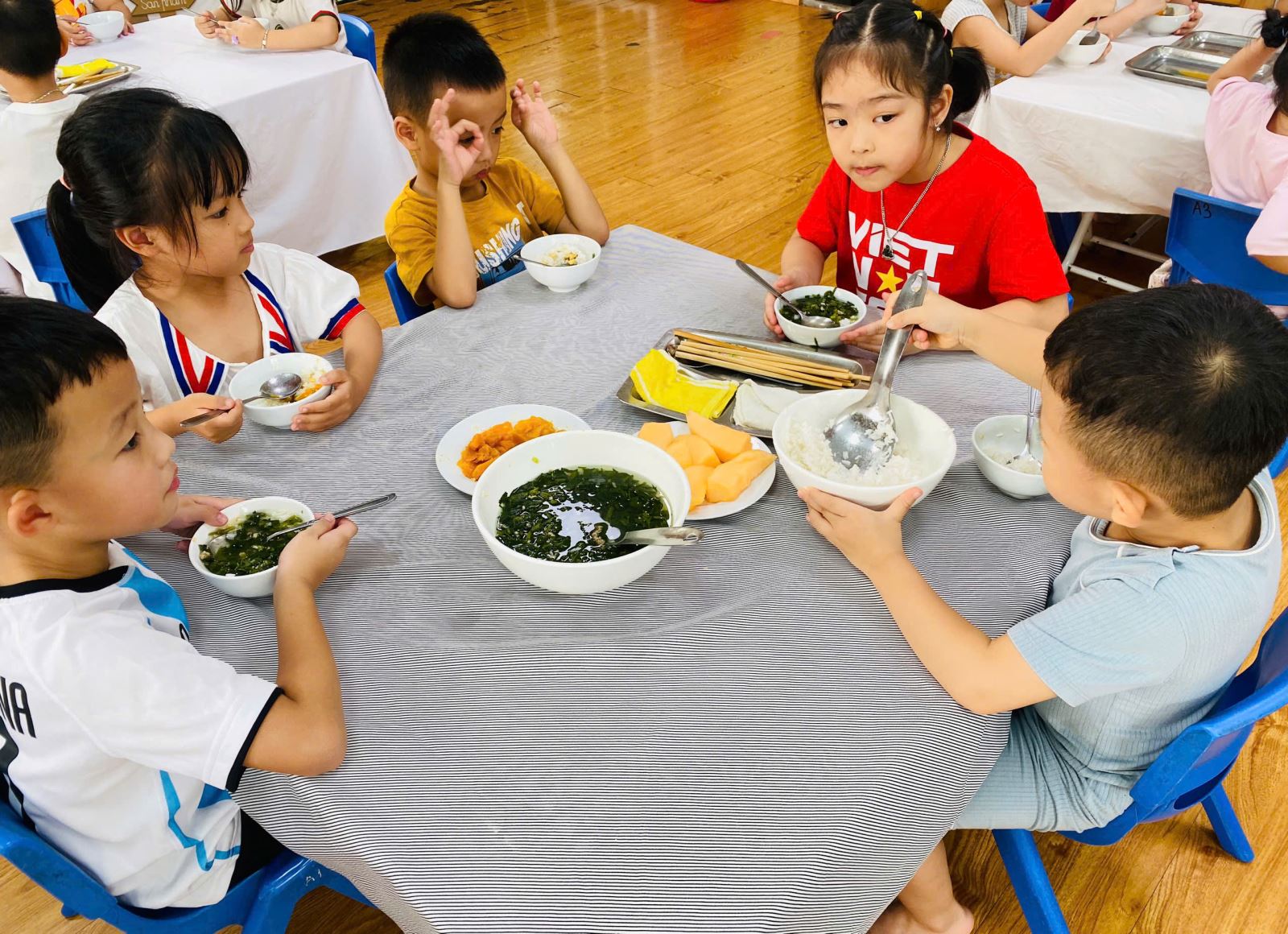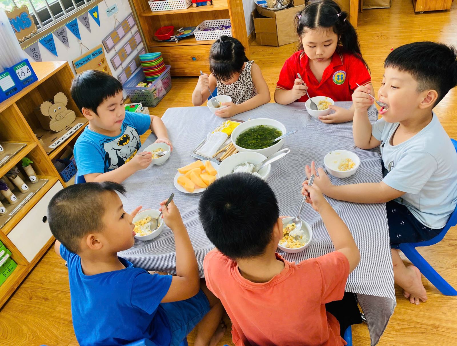 Khi bữa ăn bắt đầu, không khí rộn ràng mà vẫn đầy ấm áp. Trẻ được cô hướng dẫn cách mời cơm, cách ngồi ngay ngắn, tự xúc ăn gọn gàng và biết nhường nhịn, chia sẻ với bạn bên cạnh. Những tiếng cười giòn tan vang lên khi các bạn nhỏ cùng nhau thưởng thức món ăn ngon miệng, vừa ăn vừa trò chuyện. Bữa cơm ấy không chỉ đơn thuần là lúc ăn uống mà còn trở thành khoảng thời gian ý nghĩa để các con học kỹ năng sống, học cách quan tâm và yêu thương nhau.