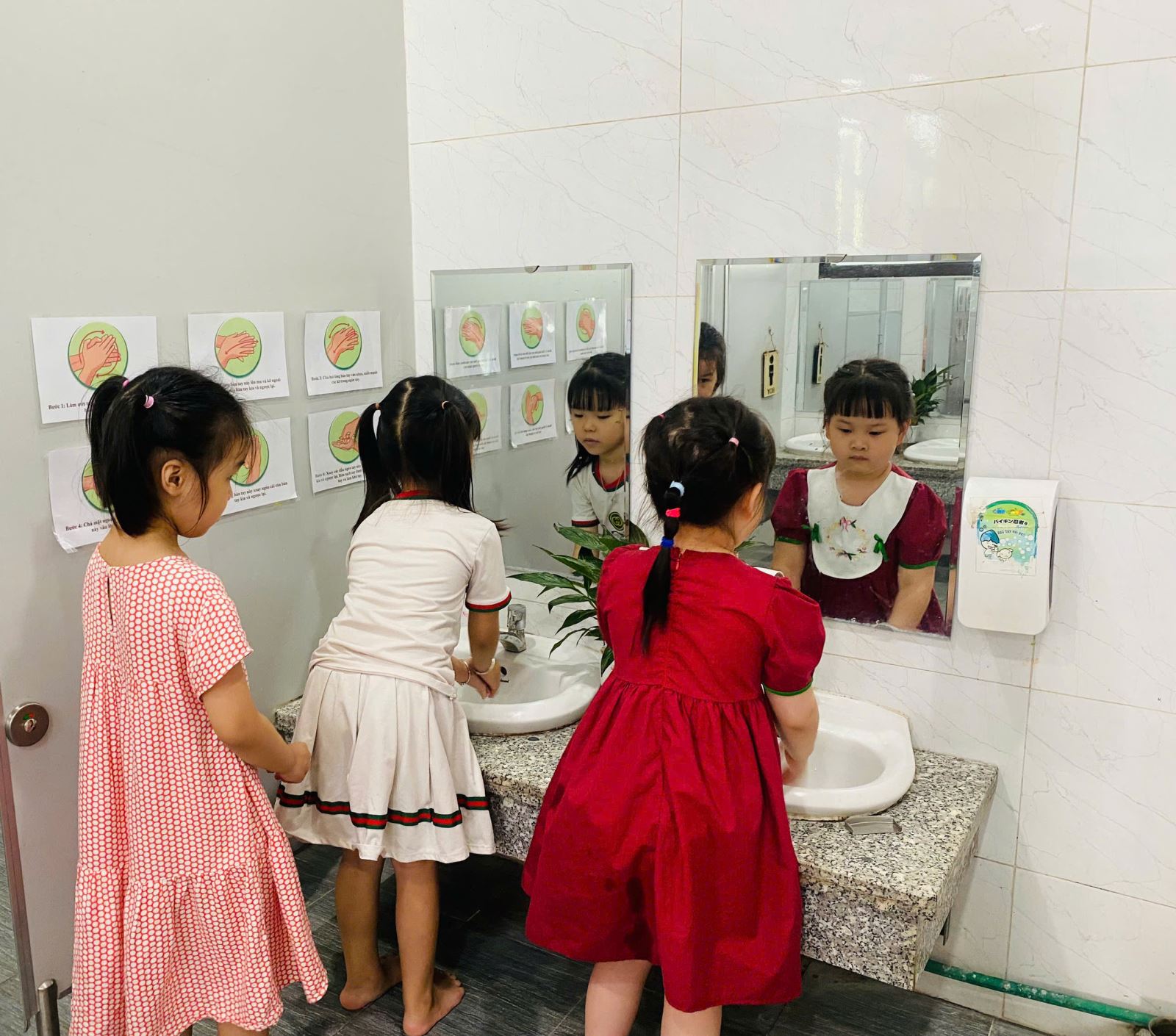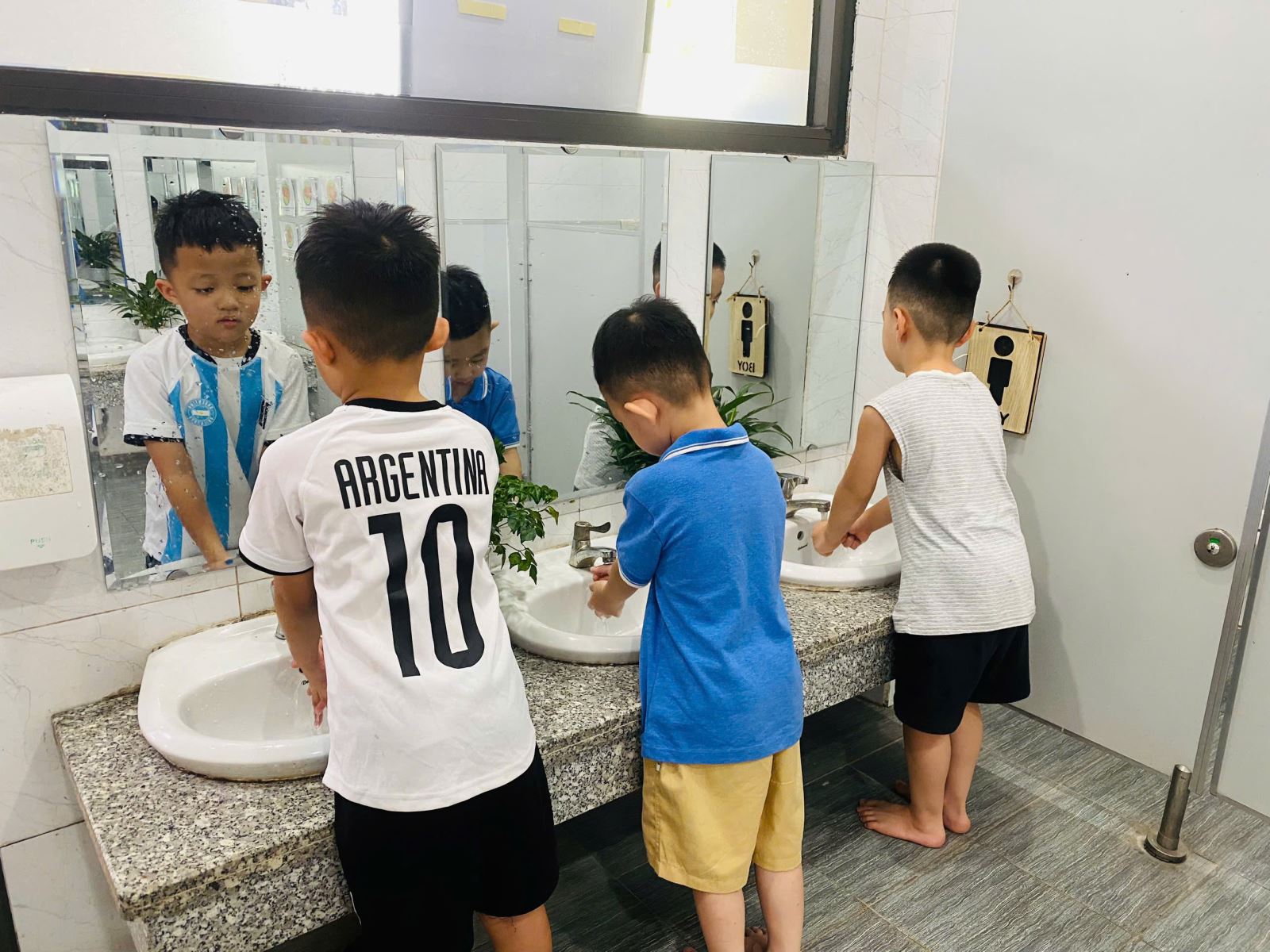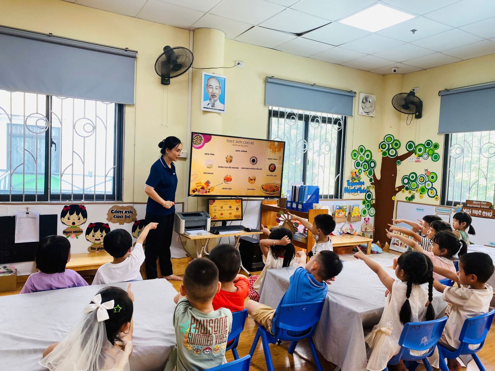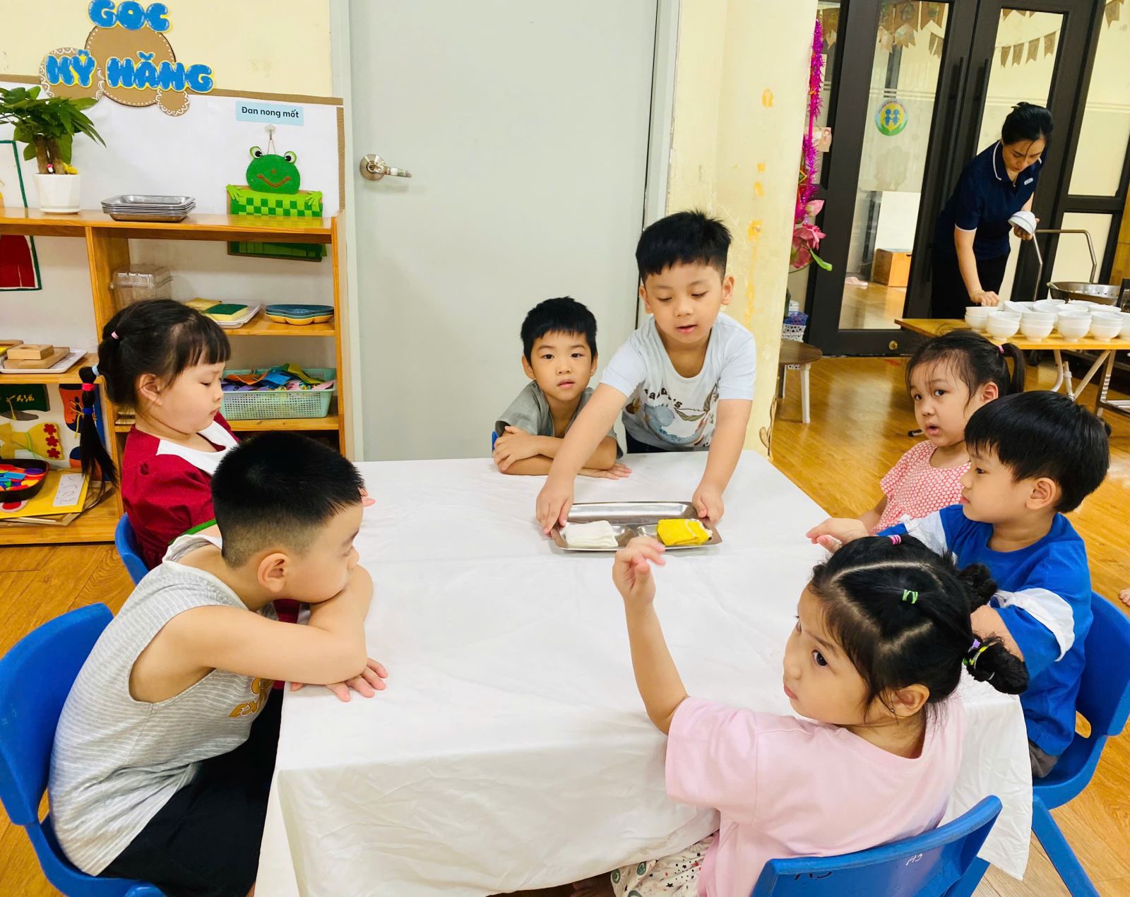 Khi bữa ăn bắt đầu, không khí rộn ràng mà vẫn đầy ấm áp. Trẻ được cô hướng dẫn cách mời cơm, cách ngồi ngay ngắn, tự xúc ăn gọn gàng và biết nhường nhịn, chia sẻ với bạn bên cạnh. Những tiếng cười giòn tan vang lên khi các bạn nhỏ cùng nhau thưởng thức món ăn ngon miệng, vừa ăn vừa trò chuyện. Bữa cơm ấy không chỉ đơn thuần là lúc ăn uống mà còn trở thành khoảng thời gian ý nghĩa để các con học kỹ năng sống, học cách quan tâm và yêu thương nhau.