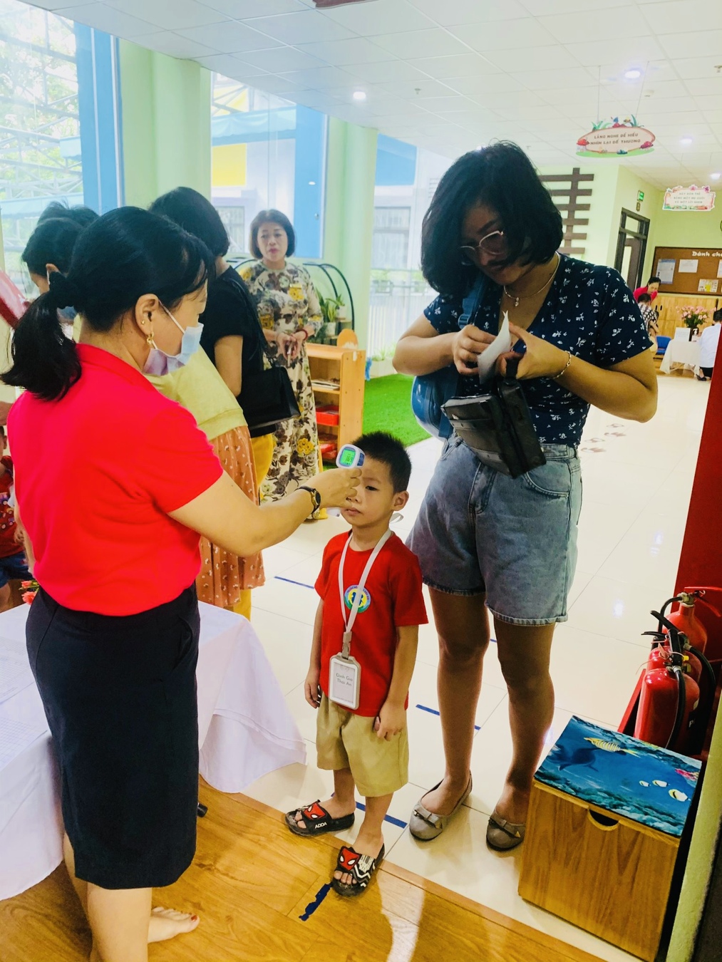 Bên cạnh những nụ cười cũng có những giọt nước mắt nhạt nhòa của các bé mới lần đầu tiên đi học. Các cô giáo rất ân cần chào đón các bé đến với không gian lớp học - ngôi trường khang trang, sạch đẹp, tràn ngập tình yêu thương vô bờ bến của cô đối với bé.