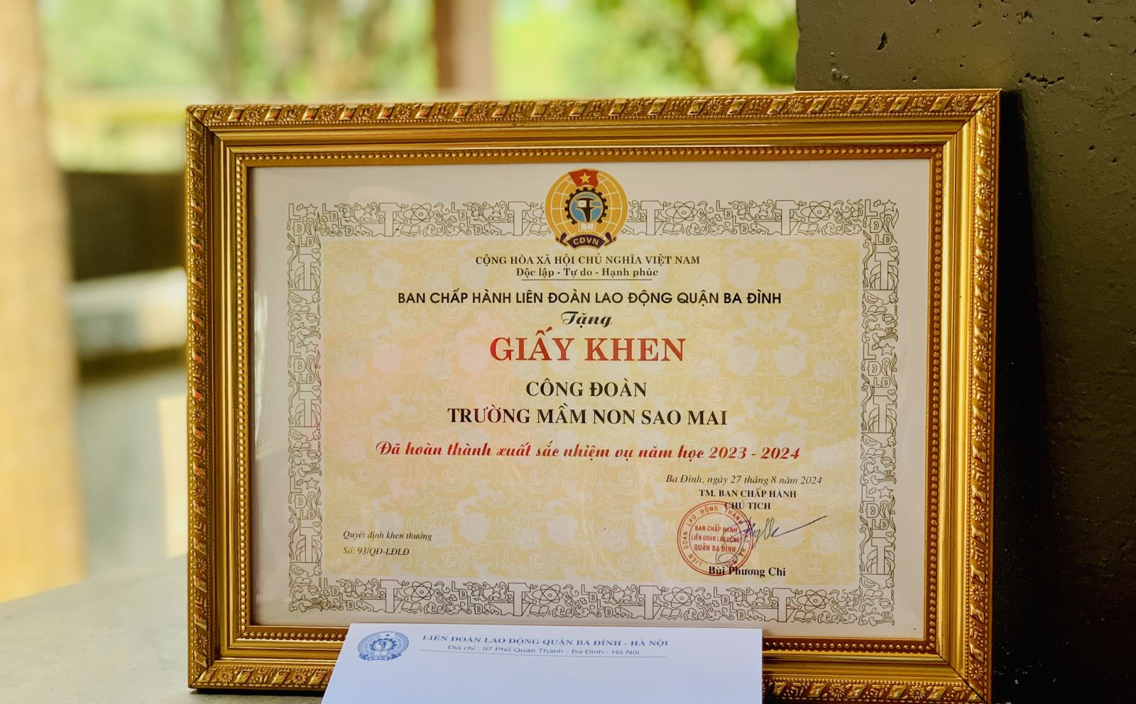 Công đoàn trường Mầm non Sao Mai, với những thành tích nổi bật, vinh dự được Ban Chấp hành Liên đoàn Lao động quận Ba Đình tặng Giấy khen hoàn thành Xuất sắc nhiệm vụ năm học 2023-2024.