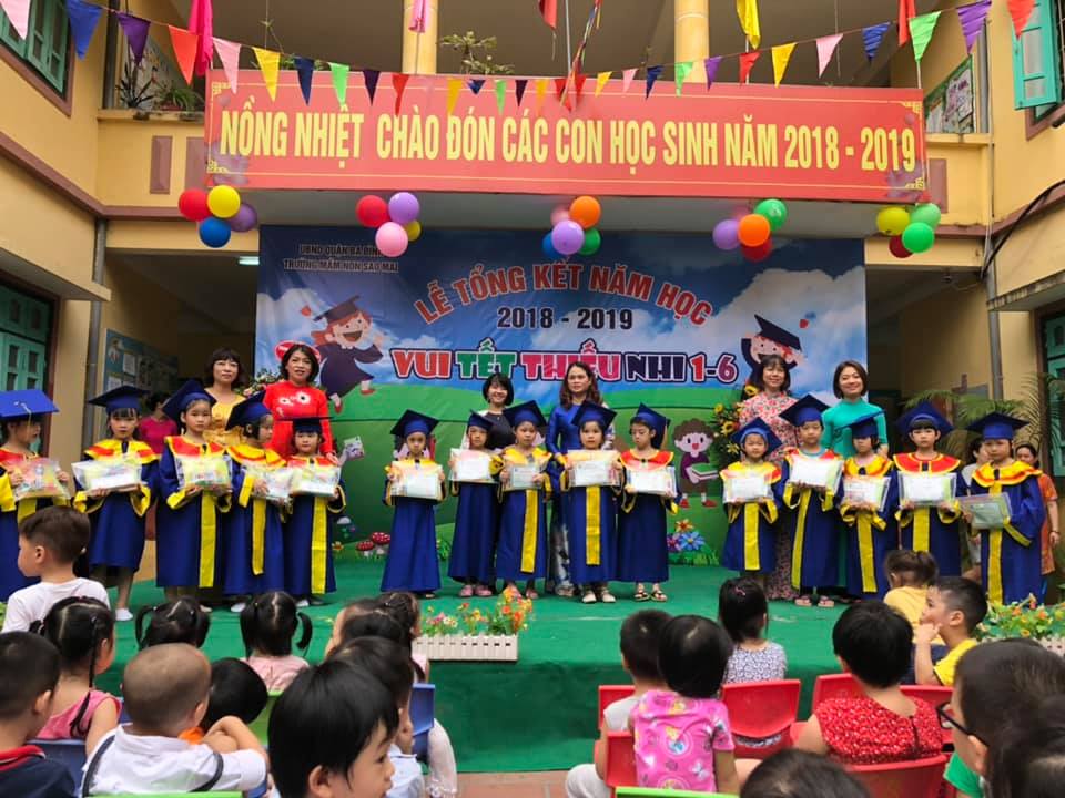 Trong không khí trang trọng và dạt dào cảm xúc của buổi lễ, mở đầu bài diễn văn bế giảng năm học 2018-2019, Cô Đặng Thị Thanh Hồng – Hiệu trưởng nhà trường đã đã nhiệt liệt biểu dương các cô và các bé đã có nhiều thành tích xuất sắc trong năm học 2018-2019. Trong bài phát biểu, Cô khẳng định rằng năm học vừa qua, trường ta đã gặt hái được nhiều thành tích xuất sắc. Các bé đạt thành tích "Cháu ngoan bác Hồ", "Bé chăm ngoan" háo hức được ban giám hiệu nhà trường trịnh trọng trao phần thưởng cho thành tích đạt được của các bé.