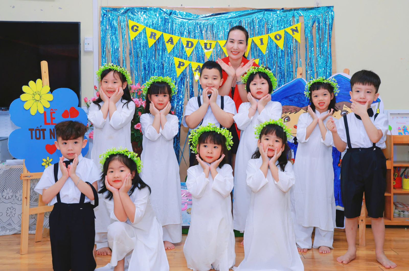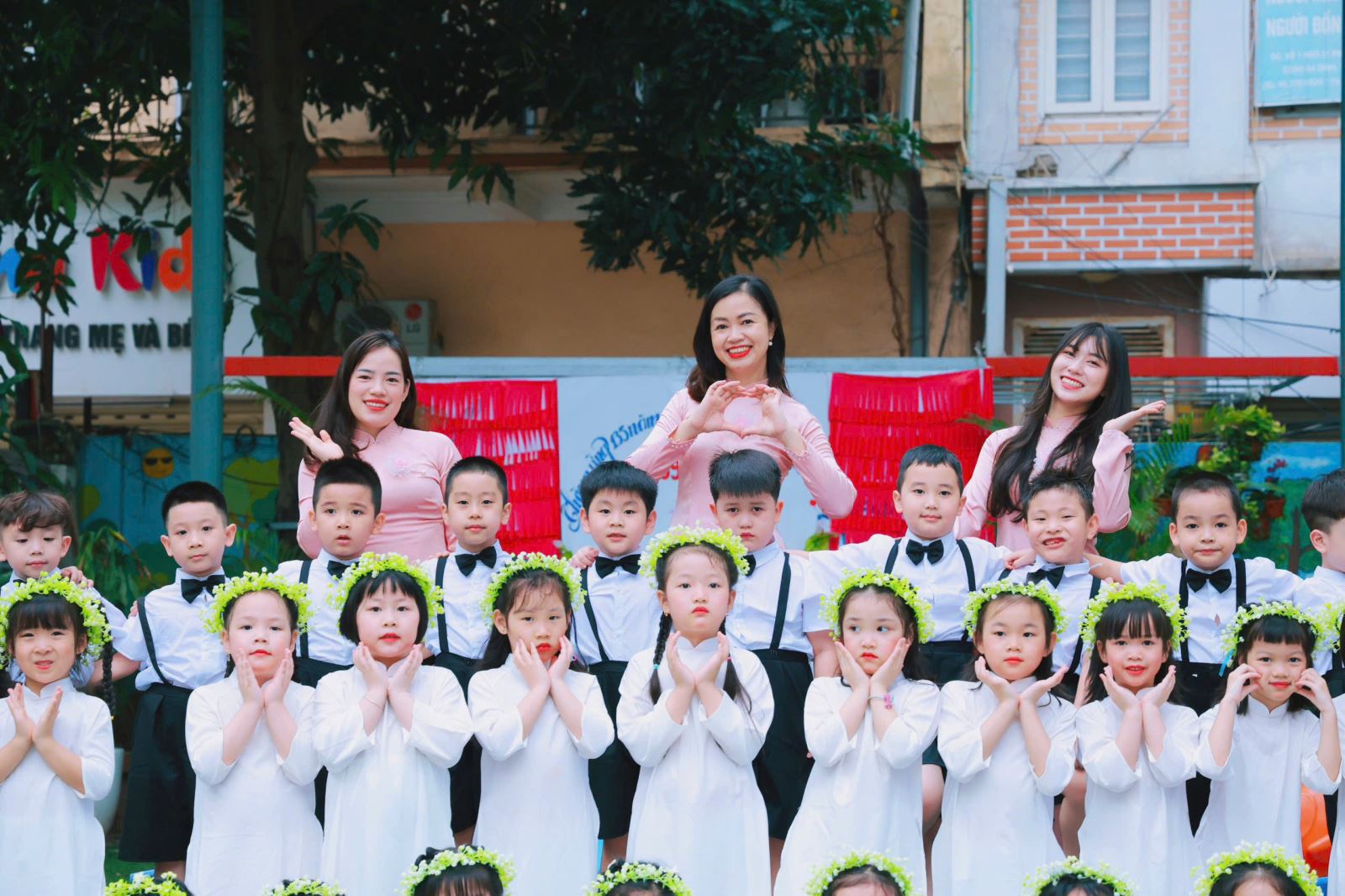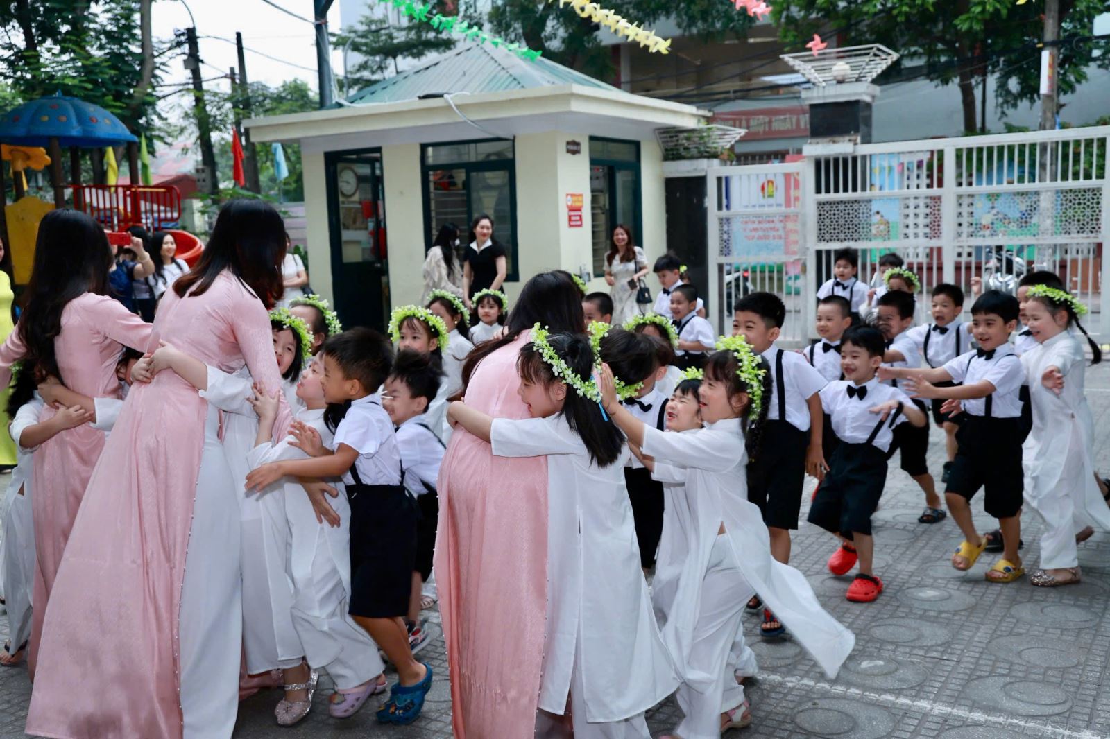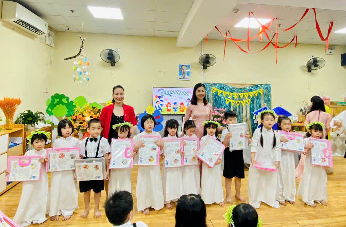Tiếng hát, điệu múa của các bé vang lên như lời chào tạm biệt dịu dàng, như lời cảm ơn các cô giáo – người đã chăm chút từng giấc ngủ, từng bữa ăn, uốn nắn từng nét chữ đầu đời. Những bó hoa tươi thắm, những ánh mắt quyến luyến là minh chứng cho một năm học trọn vẹn nghĩa tình.