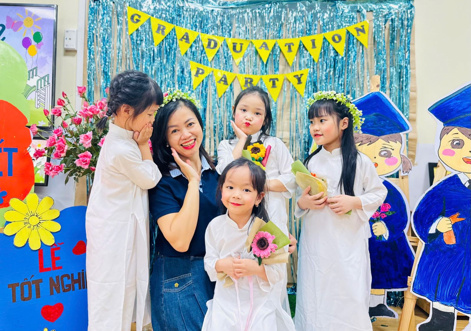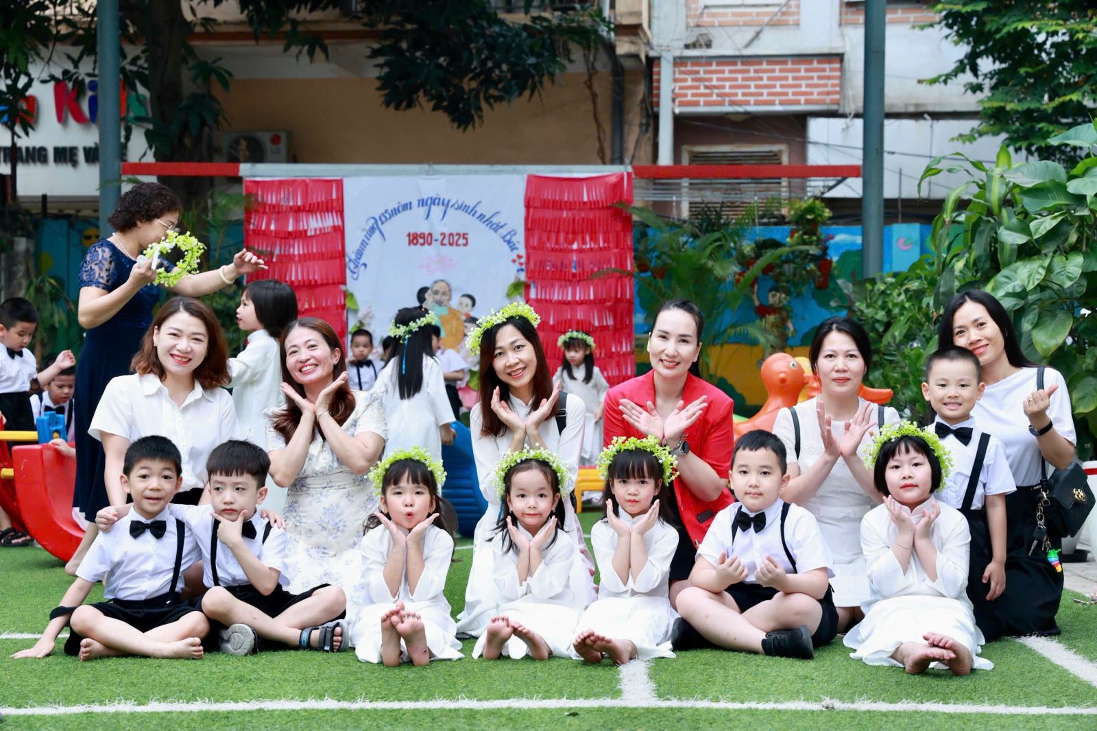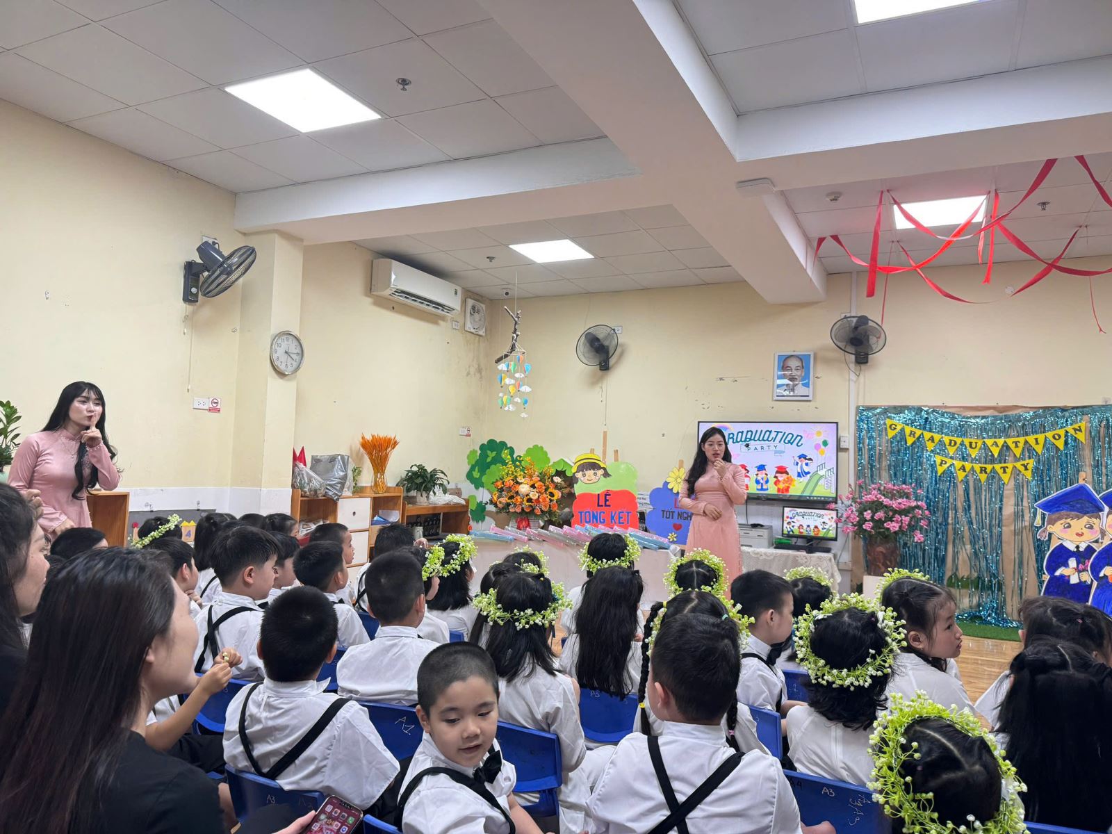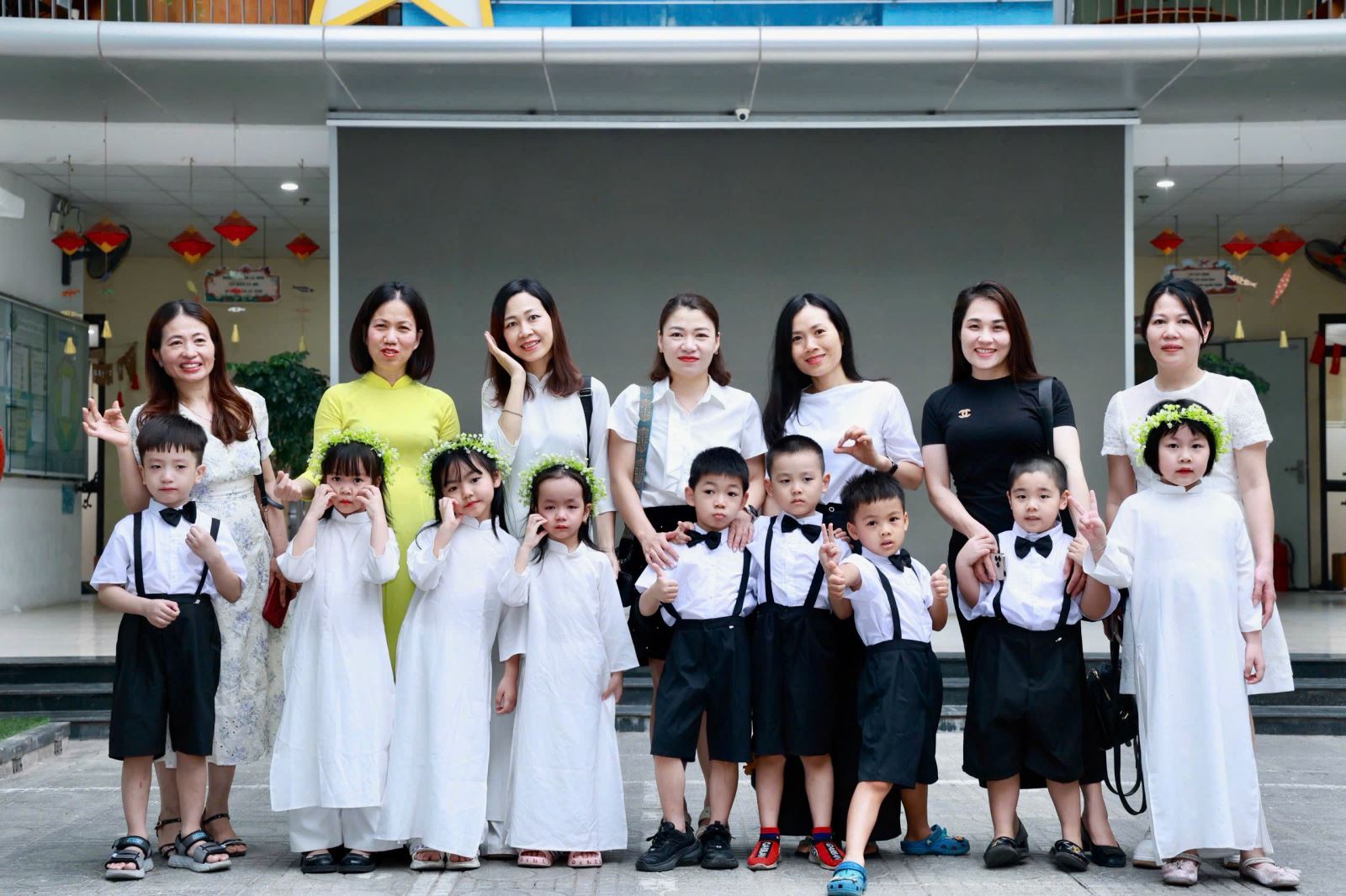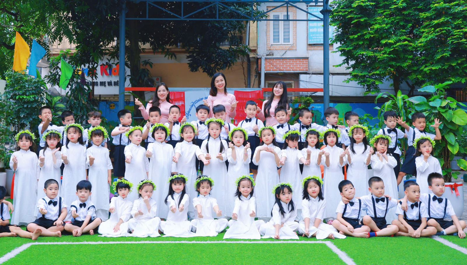 Tiếng hát, điệu múa của các bé vang lên như lời chào tạm biệt dịu dàng, như lời cảm ơn các cô giáo – người đã chăm chút từng giấc ngủ, từng bữa ăn, uốn nắn từng nét chữ đầu đời. Những bó hoa tươi thắm, những ánh mắt quyến luyến là minh chứng cho một năm học trọn vẹn nghĩa tình.