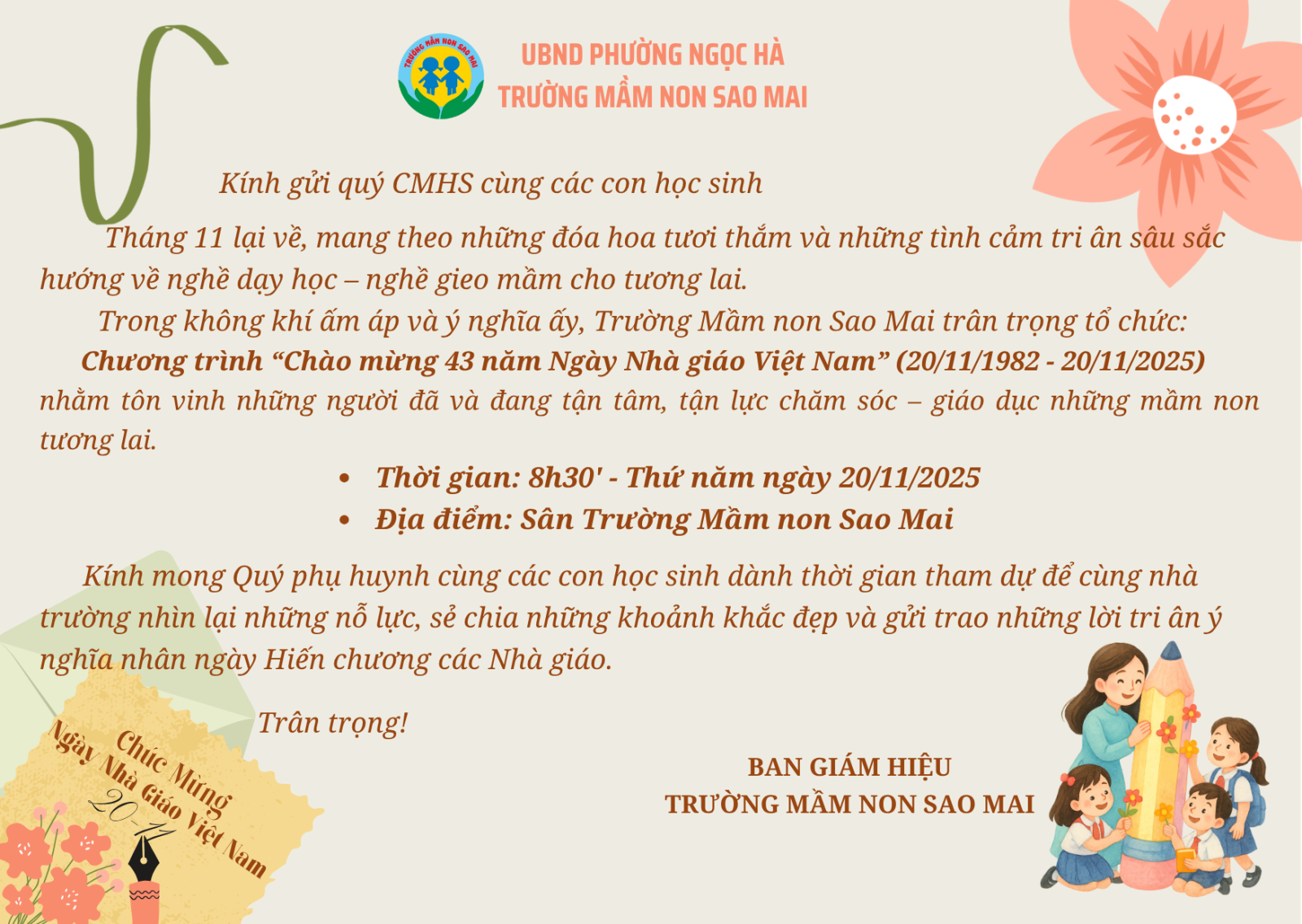 Trường Mầm non Sao Mai trân trọng gửi tới quý CMHS thông báo tổ chức chương trình "Chào mừng 43 năm ngày Nhà giáo Việt Nam" (20/11/1982 - 20/11/2025) của Trường Mầm non Sao Mai