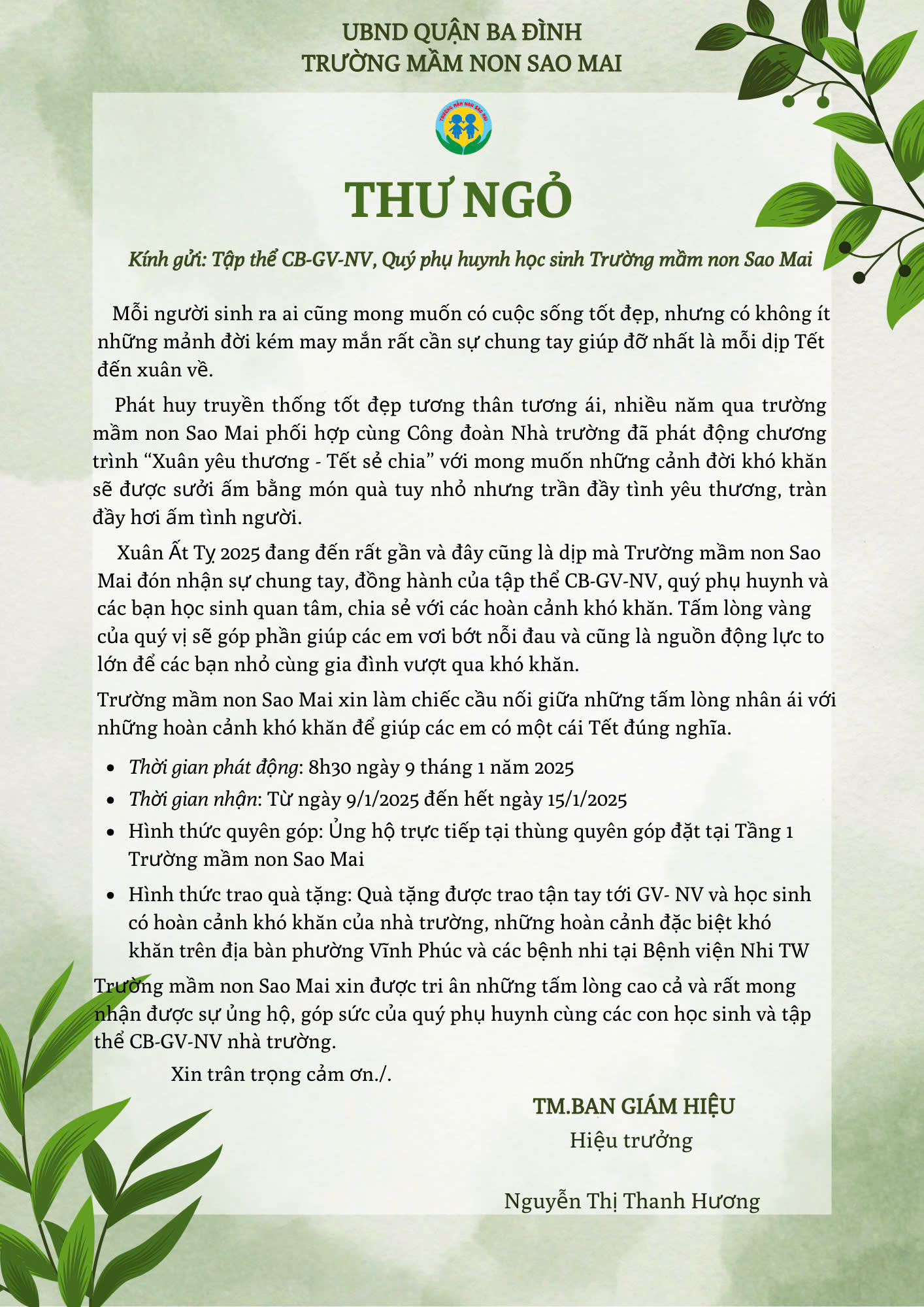 Trường Mầm non Sao Mai trân trọng gửi tới CB-GV-NV nhà trường, quý PHHS cùng các tấm lòng hảo tâm thông báo v/v tổ chức Lễ phát động từ thiện "San sẻ yêu thương - Ấm cả Mùa Xuân"