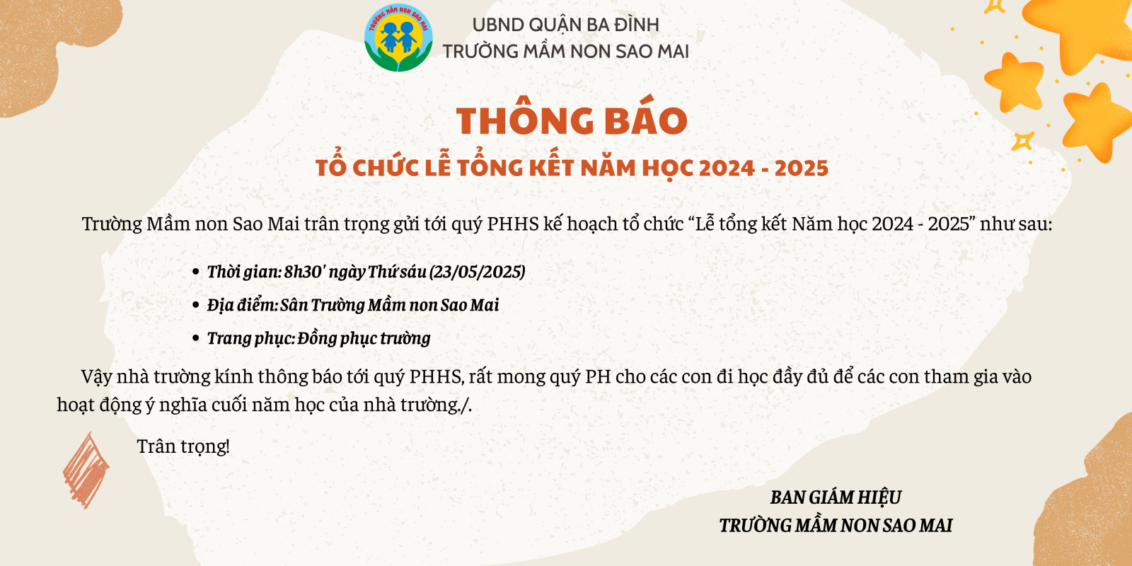 Trường Mầm non Sao Mai trân trọng gửi tới quý PHHS thông báo tổ chức "Lễ tổng kết Năm học 2024-2025"