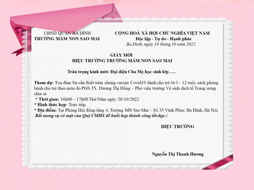 Tọa đàm sự cần thiết tiêm chủng Vacxin Covid19 dành cho trẻ từ 5-12 tuổi, cách phòng bệnh cho trẻ theo mùa do PGS.TS. Dương Thị Hồng - Phó Viện trưởng vệ sinh dịch tễ Trung ương chia sẻ với CMHS tại trường Mầm non Sao Mai vào buổi chiều ngày thứ Năm (20/10/2022).