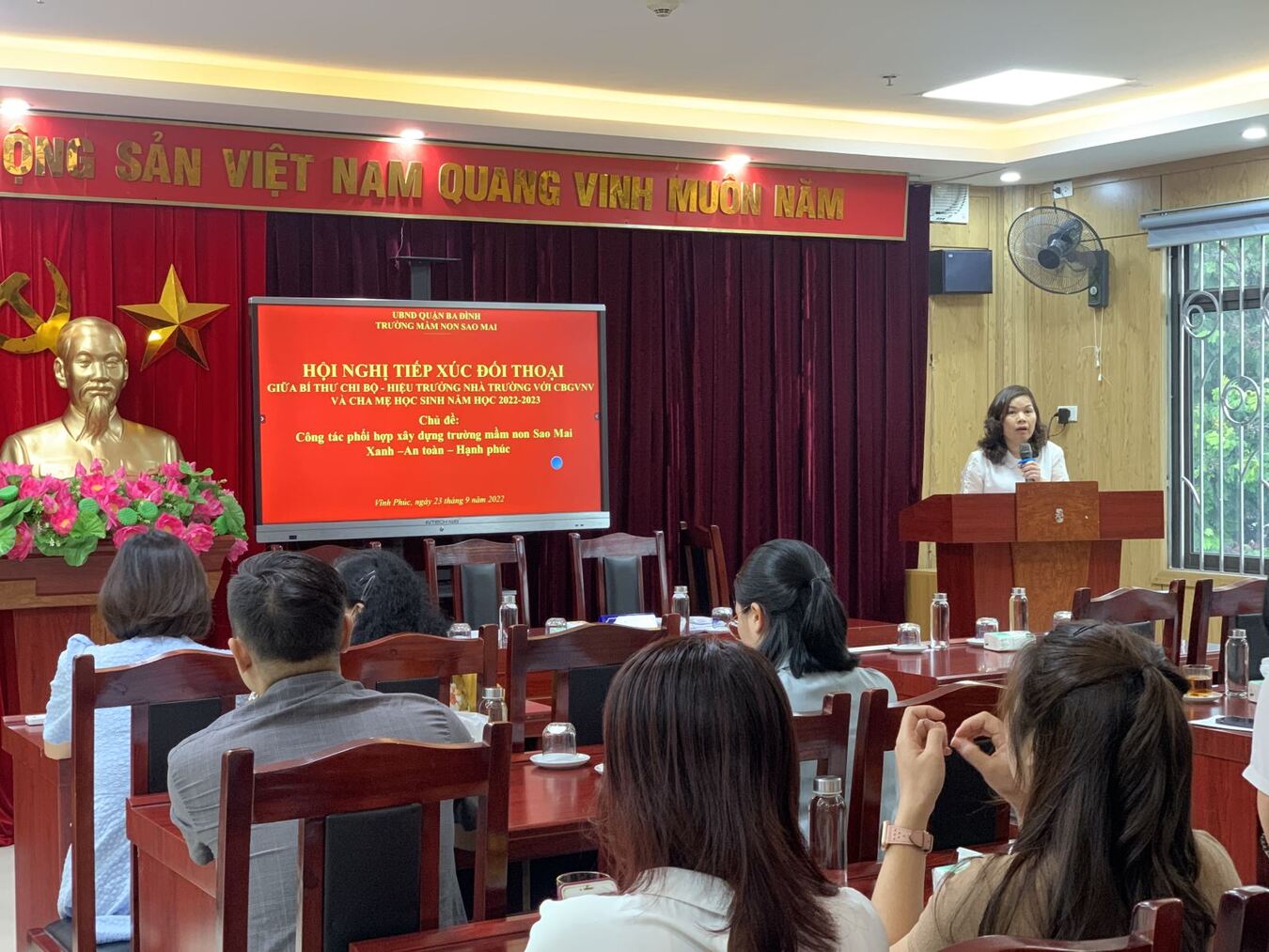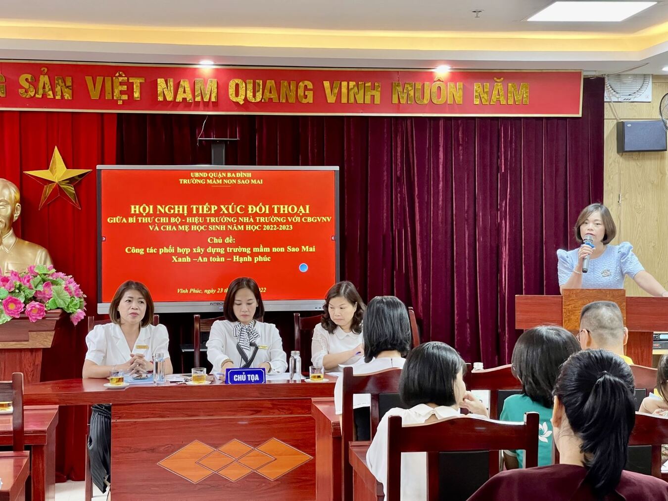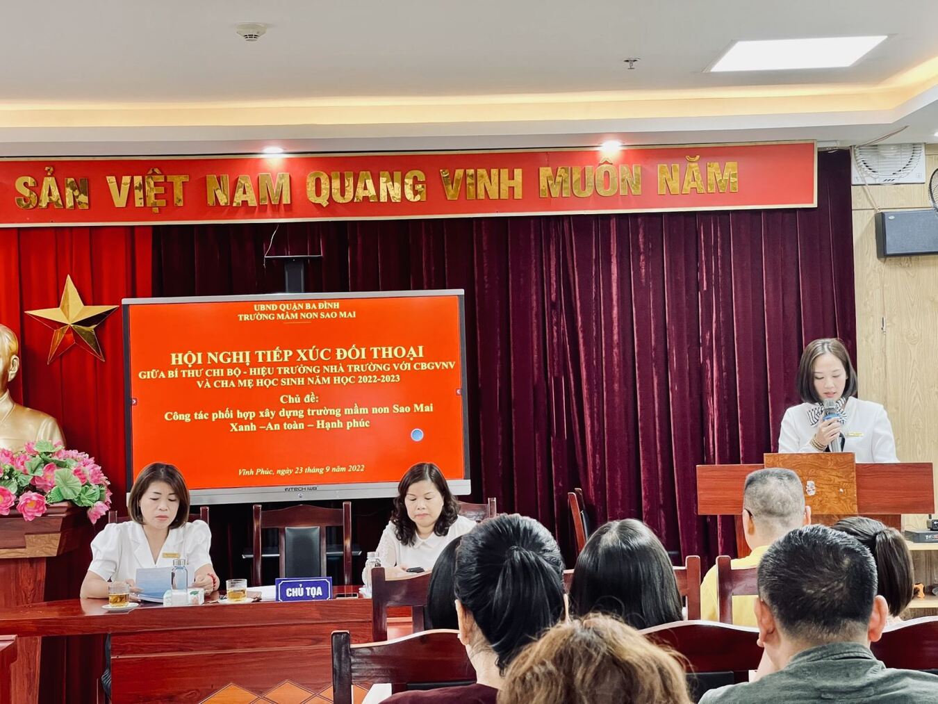 Thực hiện Quyết định số 2200-QĐ/TU ngày 25/9/2017 của Thành ủy Hà Nội; Kế hoạch số 132-KH/QU ngày 04/03/2019 của Quận ủy Ba Đình về “thực hiện Quyết định số 217-QĐ/TW, Quyết định số 218-QĐ/TW của Bộ Chính trị (khoá XI), Quyết định số 6525-QĐ/TU và Quyết định số 2200-QĐ/TU của Thành ủy Hà Nội”; Thực hiện chỉ đạo của PGD&ĐT quận Ba Đình, Chiều ngày 23/9, trường Mầm non Sao Mai đã tổ chức Hội nghị đối thoại giữa người đứng đầu cấp ủy với giáo viên, nhân viên, cha mẹ học sinh năm học 2022 – 2023 với chủ đề: “Công tác phối hợp xây dựng trường Mầm non Sao Mai Xanh - An toàn - Hạnh phúc”.