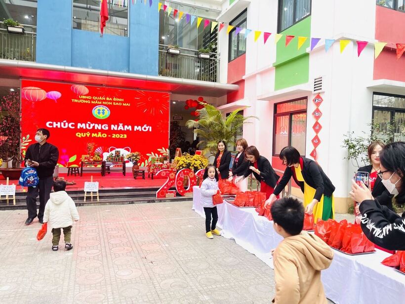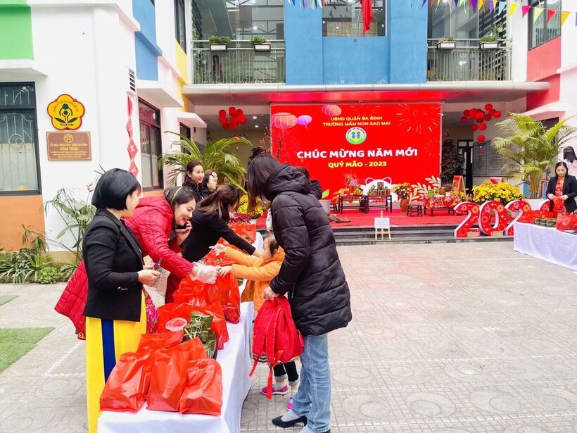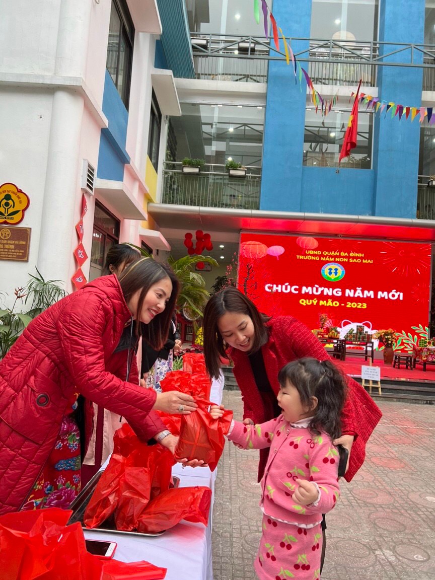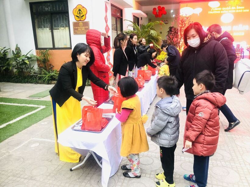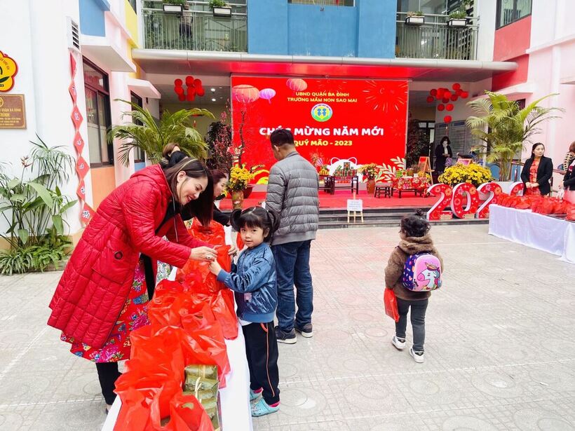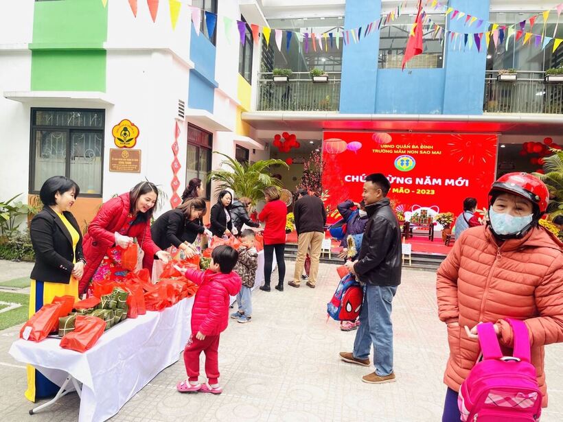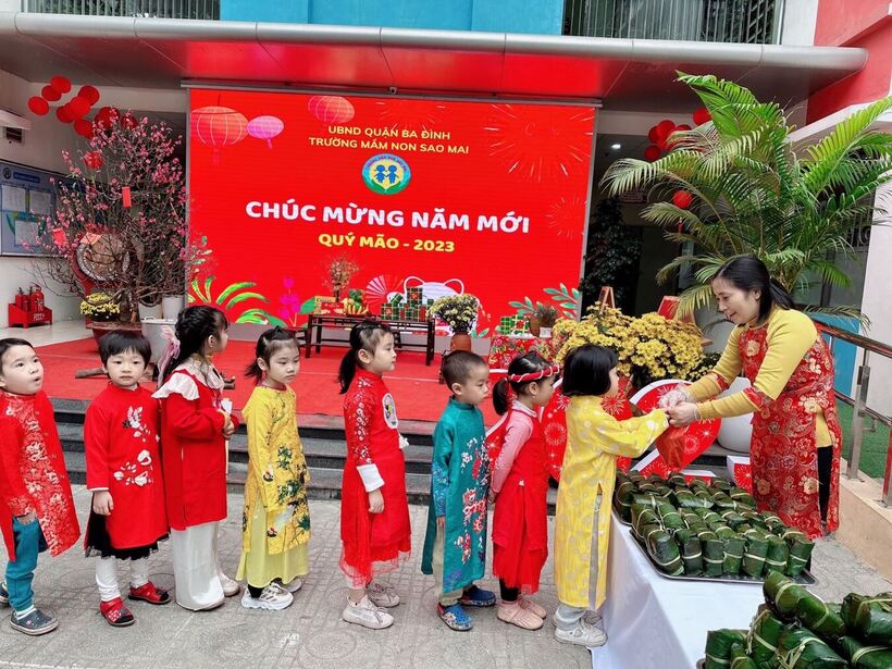 Trường Mầm non Sao Mai tổ chức phát bánh chưng cho trẻ nhân dịp Xuân Quý Mão 2023.