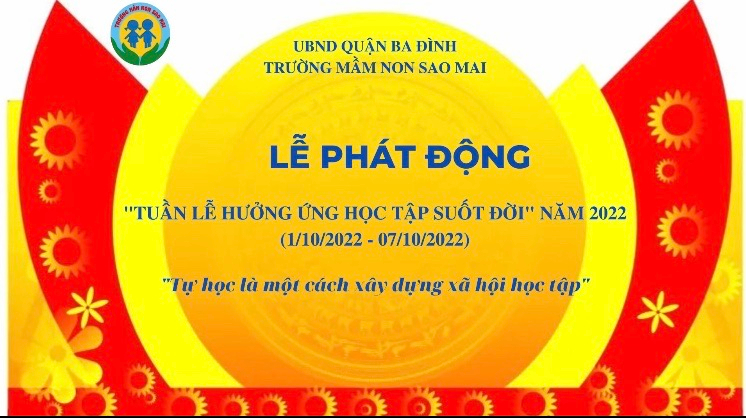 Thực hiện Kế hoạch số 261/KH-BCĐ ngày 28/9/2022 của Ban chỉ đạo xây dựng xã hội học tập quận Ba Đình, Trường Mầm non Sao Mai triển khai “Tuần lễ hưởng ứng học tập suốt đời năm 2022” với chủ đề “ Tự học là một cách xây dựng xã hội học tập" trong tập thể CBGVNV và học sinh từ ngày 01/10/2022- 07/10/2022.