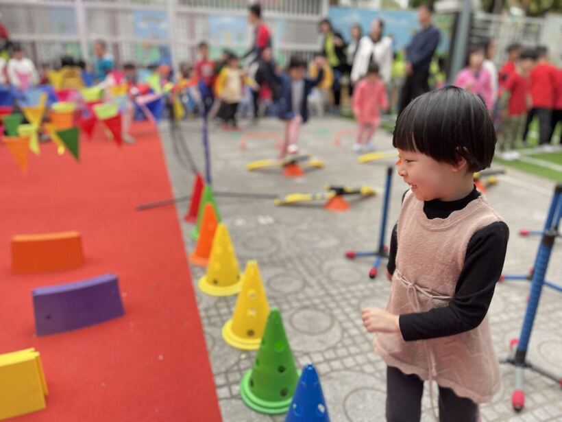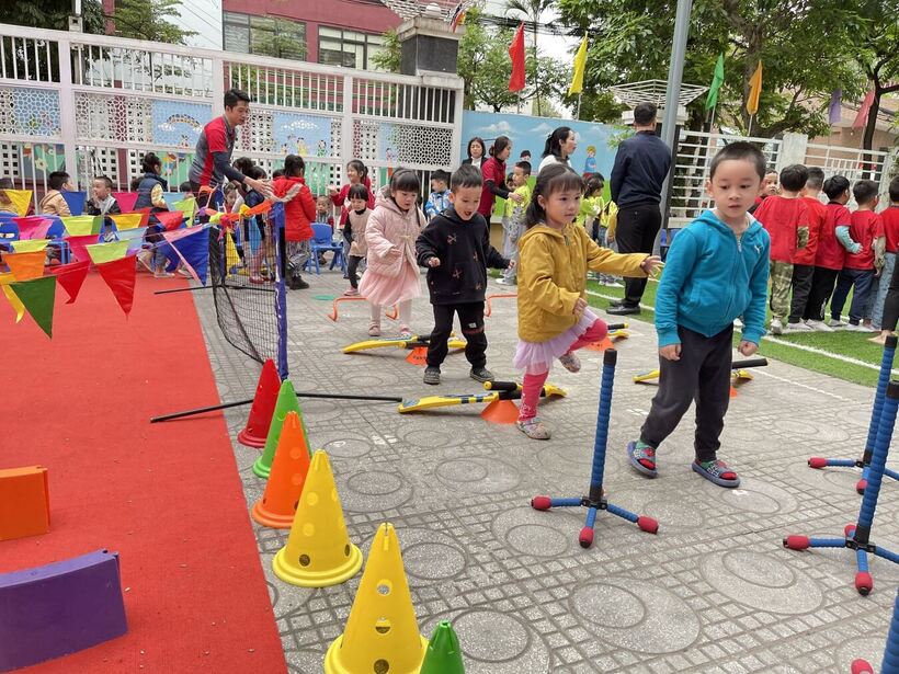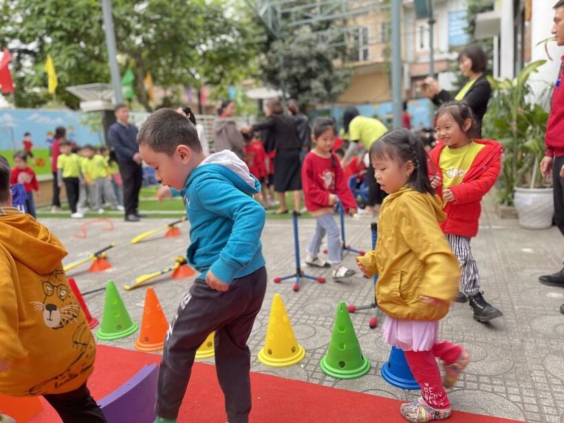 (Hình ảnh các con tham gia trải nghiệm các khu vực trò chơi vận động)