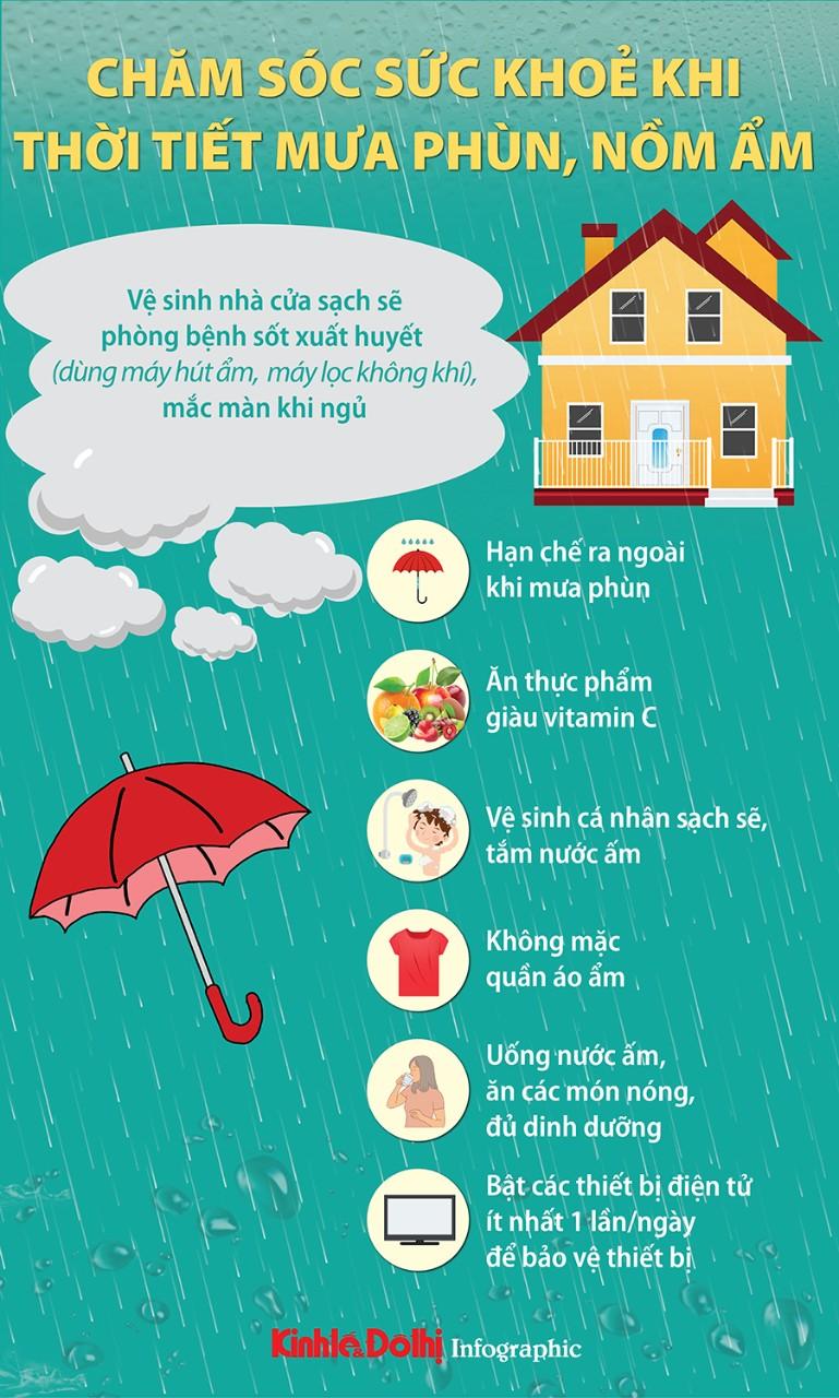 Thời tiết mưa phùn, nồm ẩm khiến cơ thể mệt mỏi, khó chịu. Những bệnh như cúm, cảm lạnh, sốt xuất huyết hoặc nhiễm khuẩn cũng có thể theo đó phát triển.