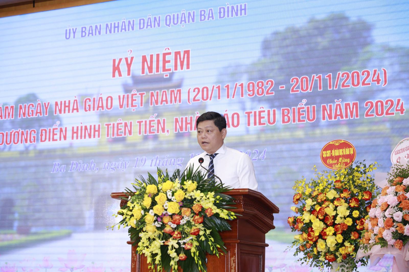Phát biểu tại buổi lễ, chúc mừng các nhà giáo, Phó Bí thư Quận ủy, Chủ tịch UBND quận Ba Đình Tạ Nam Chiến khẳng định, quận Ba Đình luôn quan tâm phát triển toàn diện đội ngũ nhà giáo, từ công tác xây dựng Đảng đến việc đầu tư cơ sở vật chất, trang thiết bị giảng dạy, học tập.