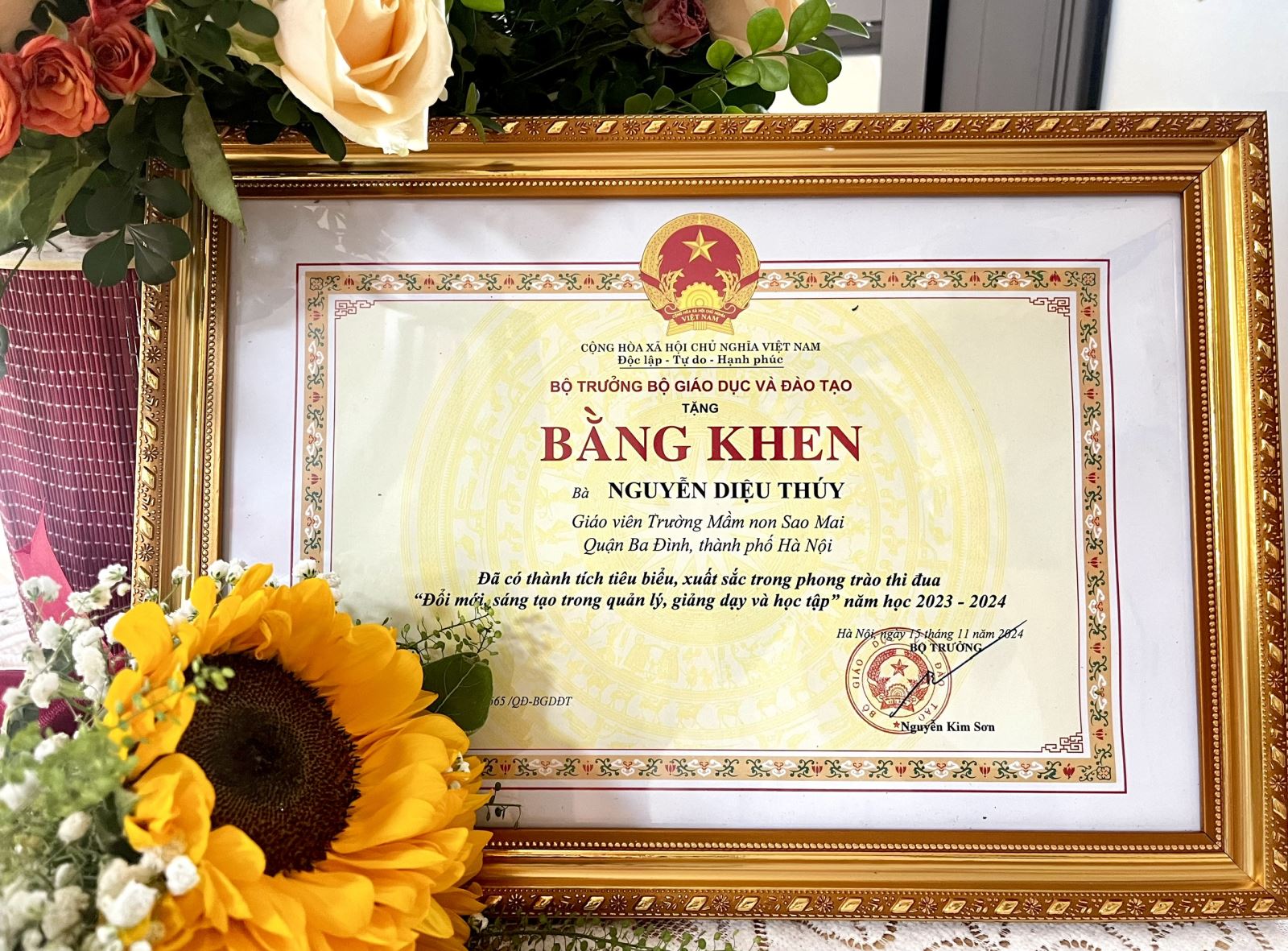 Trong danh sách được vinh danh năm nay, cô giáo Nguyễn Diệu Thúy trường Mầm non Sao Mai đã vinh dự nhận bằng khen của Bộ trưởng Bộ GD&ĐT vì “Đã có thành tích tiêu biểu, xuất sắc trong phong trào thi đua Đổi mới, sáng tạo trong quản lý, giảng dạy và học tập” năm học 2023 – 2024 và nằm trong danh sách 15 giáo viên tiêu biểu của Quận Ba Đình được đón nhận bằng khen của Bộ trưởng Bộ GDĐT.