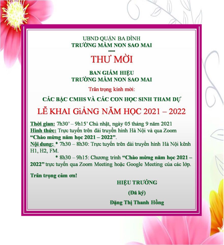 Trường Mầm non Sao Mai Kính gửi Thư mời tới các bậc phụ huynh và các con học sinh tham dự chương trình Khai giảng năm học 2021- 2022 của nhà trường.