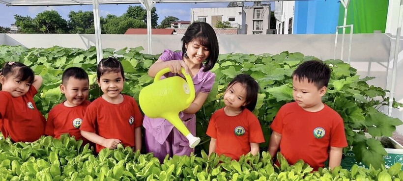 Cô Nguyễn Thùy Dung cùng trẻ chăm sóc vườn rau xanh.